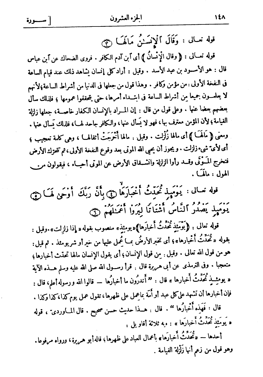 قَوْلُهُ تَعَالَى: (يَوْمَئِذٍ تُحَدِّثُ أَخْبارَها) يَوْمَئِذٍ مَنْصُوبٌ بِقَوْلِهِ: إِذا زُلْزِلَتِ. وَقِيلَ: بِقَوْلِهِ تُحَدِّثُ أَخْبارَها، أَيْ تُخْبِرُ الْأَرْضُ بِمَا عُمِلَ عَلَيْهَا مِنْ خَيْرٍ أَوْ شَرٍّ يَوْمَئِذٍ. ثُمَّ قِيلَ: هُوَ مِنْ قَوْلِ اللَّهِ تَعَالَى. وَقِيلَ: مِنْ قَوْلِ الْإِنْسَانِ، أي يقول الإنسان مالها تُحَدِّثُ أَخْبَارَهَا، مُتَعَجِّبًا. وَفِي التِّرْمِذِيِّ عَنْ أَبِي هُرَيْرَةَ قَالَ: قَرَأَ رَسُولُ اللَّهِ صَلَّى اللَّهُ عَلَيْهِ وَسَلَّمَ هَذِهِ الْآيَةَ يَوْمَئِذٍ تُحَدِّثُ أَخْبارَها قال: (أتدرون ما أخبارها- قالوا الله ورسوله أَعْلَمُ، قَالَ: فَإِنَّ أَخْبَارَهَا أَنْ تَشْهَدَ عَلَى كُلِّ عَبْدٍ أَوْ أَمَةٍ بِمَا عَمِلَ عَلَى ظَهْرِهَا، تَقُولُ عَمِلَ يَوْمَ كَذَا، كَذَا وَكَذَا. قَالَ: (فَهَذِهِ أَخْبَارُهَا). قَالَ: هَذَا حَدِيثٌ حَسَنٌ صَحِيحٌ. قَالَ الْمَاوَرْدِيُّ، قَوْلُهُ يَوْمَئِذٍ تُحَدِّثُ أَخْبارَها: فِيهِ ثَلَاثَةُ أَقَاوِيلَ: أَحَدُهَا- تُحَدِّثُ أَخْبارَها بِأَعْمَالِ الْعِبَادِ عَلَى ظَهْرِهَا، قَالَهُ أَبُو هُرَيْرَةَ، وَرَوَاهُ مَرْفُوعًا. وَهُوَ قَوْلُ مَنْ زَعَمَ أَنَّهَا زَلْزَلَةُ القيامة.