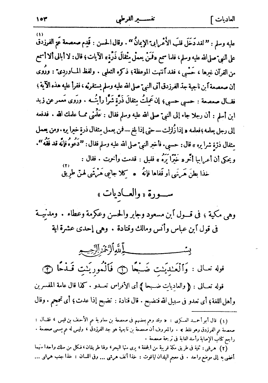 قَوْلُهُ تَعَالَى: (وَالْعادِياتِ ضَبْحاً) أَيِ الْأَفْرَاسُ تْعدُو. كَذَا قَالَ عَامَّةُ الْمُفَسِّرِينَ وَأَهْلُ اللُّغَةِ، أَيْ تَعْدُو فِي سَبِيلِ اللَّهِ فَتَضْبَحُ. قَالَ قَتَادَةُ: تَضْبَحُ إِذَا عَدَتْ، أي تحمحم. وقال