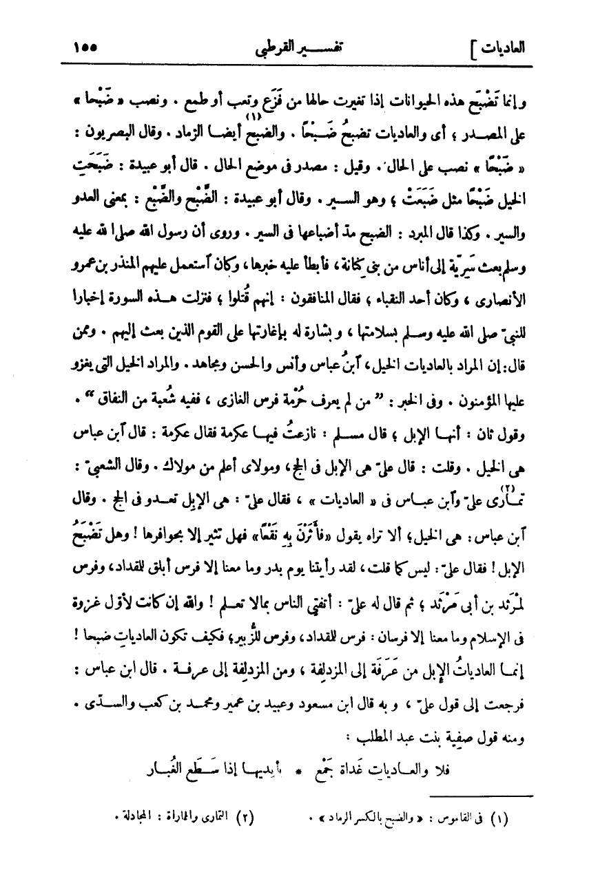 وَإِنَّمَا تَضْبَحُ هَذِهِ الْحَيَوَانَاتُ إِذَا تَغَيَّرَتْ حَالُهَا مِنْ فَزَعٍ وَتَعَبٍ أَوْ طَمَعٍ. وَنَصَبَ ضَبْحاً عَلَى الْمَصْدَرِ، أَيْ وَالْعَادِيَاتِ تَضْبَحُ ضَبْحًا. وَالضَّبْحُ «١» أَيْضًا الرَّمَادُ. وَقَالَ الْبَصْرِيُّونَ: ضَبْحاً نُصِبَ عَلَى الْحَالِ. وَقِيلَ: مَصْدَرٌ فِي مَوْضِعِ الْحَالِ. قَالَ أَبُو عُبَيْدَةَ: ضَبَحَتِ الْخَيْلُ ضَبْحًا مِثْلُ ضَبَعَتْ، وَهُوَ السَّيْرُ. وَقَالَ أَبُو عُبَيْدَةَ: الضَّبْحُ وَالضَّبْعُ: بِمَعْنَى الْعَدْوِ وَالسَّيْرِ. وَكَذَا قَالَ الْمُبَرِّدُ: الضَّبْحُ مَدُّ أَضْبَاعِهَا فِي السَّيْرِ. وَرُوِيَ أَنَّ رَسُولَ اللَّهِ صَلَّى اللَّهُ عَلَيْهِ وَسَلَّمَ بَعَثَ سَرِيَّةً إِلَى أُنَاسٍ مِنْ بَنِي كِنَانَةَ، فَأَبْطَأَ عَلَيْهِ خَبَرُهَا، وَكَانَ اسْتَعْمَلَ عَلَيْهِمْ الْمُنْذِرَ بْنَ عَمْرٍو الْأَنْصَارِيَّ، وَكَانَ أَحَدَ النُّقَبَاءِ، فَقَالَ الْمُنَافِقُونَ: إِنَّهُمْ قُتِلُوا، فَنَزَلَتْ هَذِهِ السُّورَةُ إِخْبَارًا لِلنَّبِيِّ صَلَّى اللَّهُ عَلَيْهِ وَسَلَّمَ بِسَلَامَتِهَا، وَبِشَارَةً لَهُ بِإِغَارَتِهَا عَلَى الْقَوْمِ الَّذِينَ بَعَثَ إِلَيْهِمْ. وَمِمَّنْ قَالَ: إِنَّ الْمُرَادَ بِالْعَادِيَاتِ الْخَيْلَ، ابْنُ عَبَّاسٍ وَأَنَسٌ وَالْحَسَنُ وَمُجَاهِدٌ. وَالْمُرَادُ الْخَيْلُ الَّتِي يَغْزُو عَلَيْهَا الْمُؤْمِنُونَ. وَفِي الْخَبَرِ: (مَنْ لَمْ يَعْرِفْ حُرْمَةَ فرس الغازي، فيه شُعْبَةٌ مِنَ النِّفَاقِ). وَقَوْلٌ ثَانٍ: أَنَّهَا الْإِبِلُ، قَالَ مُسْلِمٌ: نَازَعْتُ فِيهَا عِكْرِمَةَ فَقَالَ عِكْرِمَةُ: قَالَ ابْنُ عَبَّاسٍ هِيَ الْخَيْلُ. وَقُلْتُ: قَالَ عَلِيٌّ هِيَ الْإِبِلُ فِي الْحَجِّ، وَمَوْلَايَ أَعْلَمُ مِنْ مَوْلَاكَ. وَقَالَ الشَّعْبِيُّ: تَمَارَى «٢» عَلِيٌّ وَابْنُ عَبَّاسٍ فِي الْعادِياتِ، فَقَالَ عَلِيٌّ: هِيَ الْإِبِلُ تَعْدُو فِي الْحَجِّ. وَقَالَ ابْنُ عَبَّاسٍ: هِيَ الْخَيْلُ، أَلَا تَرَاهُ يَقُولُ فَأَثَرْنَ بِهِ نَقْعاً [العاديات: ٤] فَهَلْ تُثِيرُ إِلَّا بِحَوَافِرِهَا! وَهَلْ تَضْبَحُ الْإِبِلُ! فَقَالَ عَلِيٌّ: لَيْسَ كَمَا قُلْتَ، لَقَدْ رَأَيْتُنَا يَوْمَ بَدْرٍ وَمَا مَعَنَا إِلَّا فَرَسٌ أَبْلَقُ لِلْمِقْدَادِ، وَفَرَسٌ لِمَرْثَدِ بْنِ أَبِي مَرْثَدٍ، ثُمَّ قَالَ لَهُ عَلِيٌّ: أَتُفْتِي النَّاسَ بِمَا لَا تَعْلَمُ! وَاللَّهِ إِنْ كَانَتْ لَأَوَّلَ غَزْوَةٍ فِي الْإِسْلَامِ وَمَا مَعَنَا إِلَّا فَرَسَانِ: فَرَسٌ لِلْمِقْدَادِ، وَفَرَسٌ لِلزُّبَيْرِ، فَكَيْفَ تَكُونُ الْعَادِيَاتُ ضَبْحًا! إِنَّمَا الْعَادِيَاتُ الْإِبِلُ مِنْ عَرَفَةَ إِلَى الْمُزْدَلِفَةِ، وَمِنْ الْمُزْدَلِفَةِ إِلَى عَرَفَةَ. قَالَ ابْنُ عَبَّاسٍ: فَرَجَعْتُ إِلَى قَوْلِ عَلِيٍّ، وَبِهِ قَالَ ابْنُ مَسْعُودٍ وَعُبَيْدُ بْنُ عُمَيْرٍ وَمُحَمَّدُ بْنُ كَعْبٍ وَالسُّدِّيُّ. وَمِنْهُ قَوْلُ صَفِيَّةَ بِنْتِ عَبْدِ الْمُطَّلِبِ:
