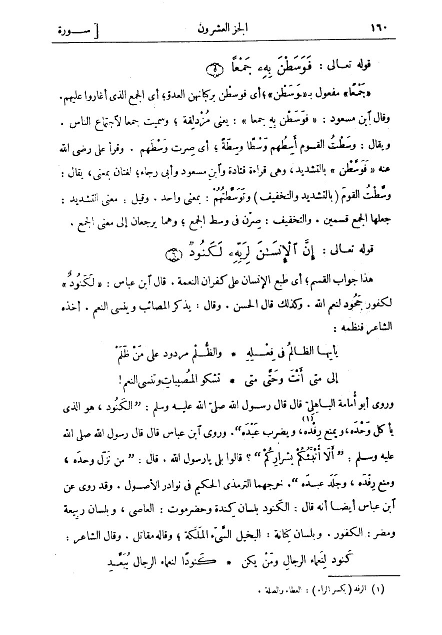 جَمْعاً مفعول ب فَوَسَطْنَ، أَيْ فَوَسَطْنَ بِرُكْبَانِهِنَّ الْعَدُوَّ، أَيِ الْجَمْعَ الَّذِي أَغَارُوا عَلَيْهِمْ. وَقَالَ ابْنُ مَسْعُودٍ: فَوَسَطْنَ بِهِ جَمْعاً: يَعْنِي مُزْدَلِفَةَ، وَسُمِّيَتْ جَمْعًا لِاجْتِمَاعِ النَّاسِ. وَيُقَالُ: وَسَطْتُ الْقَوْمَ أَسِطُهُمْ وَسْطًا وَسِطَةً، أَيْ صِرْتُ وَسْطُهُمْ. وَقَرَأَ عَلِيٌّ رَضِيَ اللَّهُ عَنْهُ (فَوَسَّطْنَ) بِالتَّشْدِيدِ، وَهِيَ قِرَاءَةُ قَتَادَةَ وَابْنِ مَسْعُودٍ وَأَبِي رَجَاءٍ، لُغَتَانِ بِمَعْنًى، يُقَالُ: وَسَطْتُ الْقَوْمَ (بِالتَّشْدِيدِ وَالتَّخْفِيفِ) وَتَوَسَّطَهُمْ: بِمَعْنًى وَاحِدٍ. وَقِيلَ: مَعْنَى التَّشْدِيدِ: جَعْلُهَا الْجَمْعَ قِسْمَيْنِ. وَالتَّخْفِيفِ: صِرْنَ فِي وَسَطِ الْجَمْعِ، وَهُمَا يَرْجِعَانِ إِلَى مَعْنَى الْجَمْعِ.