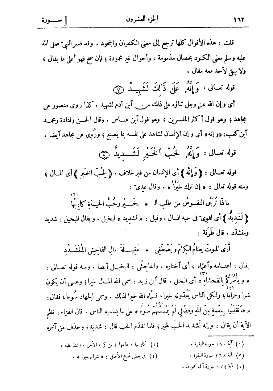 قُلْتُ: هَذِهِ الْأَقْوَالُ كُلُّهَا تَرْجِعُ إِلَى مَعْنَى الْكُفْرَانِ وَالْجُحُودِ. وَقَدْ فَسَّرَ النَّبِيُّ صَلَّى اللَّهُ عَلَيْهِ وَسَلَّمَ مَعْنَى الْكَنُودِ بِخِصَالٍ مَذْمُومَةٍ، وَأَحْوَالٍ غَيْرِ مَحْمُودَةٍ، فَإِنْ صَحَّ فَهُوَ أَعْلَى مَا يقال، ولا يبقى لاحد معه مقال.