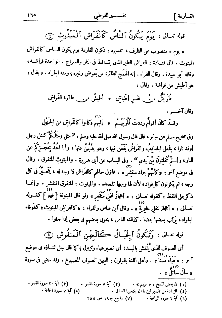 وَفِي صَحِيحِ مُسْلِمٍ عَنْ جَابِرٍ، قَالَ: قَالَ رَسُولُ اللَّهِ صَلَّى اللَّهُ عَلَيْهِ وَسَلَّمَ: (مَثَلِي وَمَثَلُكُمْ كَمَثَلِ رَجُلٍ أَوْقَدَ نَارًا، فَجَعَلَ الْجَنَادِبُ وَالْفَرَاشُ يَقَعْنَ فِيهَا، وَهُوَ يَذُبُّهُنَّ عَنْهَا، وَأَنَا آخِذٌ بِحُجَزِكُمْ عَنِ النَّارِ، وَأَنْتُمْ تَفَلَّتُونَ مِنْ يَدِي (. وَفِي الْبَابِ عَنْ أَبِي هُرَيْرَةَ. وَالْمَبْثُوثُ الْمُتَفَرِّقُ. وَقَالَ في موضع آخر: كَأَنَّهُمْ جَرادٌ مُنْتَشِرٌ «٢» [القمر: ٧]. فَأَوَّلُ حَالِهِمْ كَالْفَرَاشِ لَا وَجْهَ لَهُ، يَتَحَيَّرُ فِي كُلِّ وَجْهٍ، ثُمَّ يَكُونُونَ كَالْجَرَادِ، لِأَنَّ لَهَا وَجْهًا تَقْصِدُهُ. وَالْمَبْثُوثُ: الْمُتَفَرِّقُ وَالْمُنْتَشِرُ. وَإِنَّمَا ذُكِرَ عَلَى اللَّفْظِ: كَقَوْلِهِ تَعَالَى: أَعْجازُ نَخْلٍ مُنْقَعِرٍ «٣» [القمر: ٢٠] وَلَوْ قَالَ الْمَبْثُوثَةُ [فَهُوَ «٤»] كَقَوْلِهِ تَعَالَى: أَعْجازُ نَخْلٍ خاوِيَةٍ «٥» [الحاقة: ٧]. وَقَالَ ابْنُ عَبَّاسٍ وَالْفَرَّاءُ: كَالْفَراشِ الْمَبْثُوثِ كَغَوْغَاءِ الْجَرَادِ، يَرْكَبُ بَعْضُهَا بَعْضًا. كَذَلِكَ النَّاسُ، يَجُولُ بعضهم في بعض إذا بعثوا.