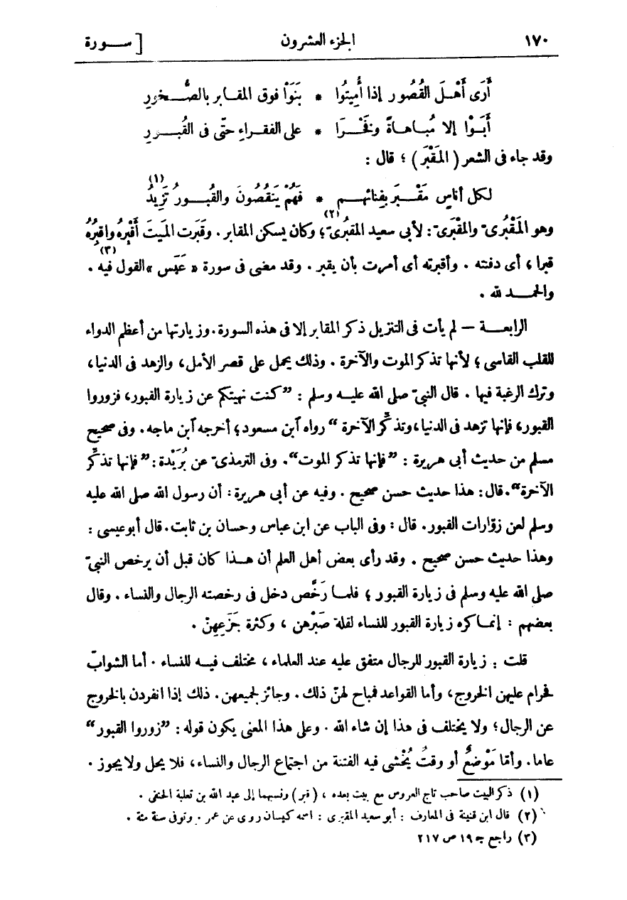 وَهُوَ الْمَقْبُرِيُّ وَالْمَقْبَرِيُّ: لِأَبِي سَعِيدٍ الْمَقْبُرِيِّ «٢»، وَكَانَ يَسْكُنُ الْمَقَابِرَ. وَقَبَرْتُ الْمَيِّتَ أَقْبِرُهُ وَأُقْبِرُهُ قَبْرًا، أَيْ دَفَنْتُهُ. وَأَقْبَرْتُهُ أَيْ أَمَرْتُ بِأَنْ يُقْبَرَ. وَقَدْ مَضَى فِي سُورَةِ" عَبَسَ" الْقَوْلُ فِيهِ «٣». وَالْحَمْدُ لِلَّهِ. الرَّابِعَةُ- لَمْ يَأْتِ فِي التَّنْزِيلِ ذِكْرُ الْمَقَابِرِ إِلَّا فِي هَذِهِ السُّورَةِ. وَزِيَارَتُهَا مِنْ أَعْظَمِ الدَّوَاءِ لِلْقَلْبِ الْقَاسِي، لِأَنَّهَا تُذَكِّرُ الْمَوْتَ وَالْآخِرَةَ. وَذَلِكَ يَحْمِلُ عَلَى قِصَرِ الْأَمَلِ، وَالزُّهْدِ فِي الدُّنْيَا، وَتَرْكِ الرَّغْبَةِ فِيهَا. قَالَ النَّبِيُّ صَلَّى اللَّهُ عَلَيْهِ وَسَلَّمَ: (كُنْتُ نَهَيْتُكُمْ عَنْ زِيَارَةِ الْقُبُورِ، فَزُورُوا الْقُبُورَ، فَإِنَّهَا تُزَهِّدُ فِي الدُّنْيَا، وَتُذَكِّرُ الْآخِرَةَ) رَوَاهُ ابْنُ مَسْعُودٍ، أَخْرَجَهُ ابْنُ مَاجَهْ. وَفِي صَحِيحِ مُسْلِمٍ مِنْ حَدِيثِ أَبِي هُرَيْرَةَ: (فَإِنَّهَا تُذَكِّرُ الْمَوْتَ). وَفِي التِّرْمِذِيِّ عَنْ بُرَيْدَةَ: (فَإِنَّهَا تُذَكِّرُ الْآخِرَةَ). قَالَ: هَذَا حَدِيثٌ حَسَنٌ صَحِيحٌ. وَفِيهِ عَنْ أَبِي هُرَيْرَةَ: أَنَّ رَسُولَ اللَّهِ صَلَّى اللَّهُ عَلَيْهِ وَسَلَّمَ لَعَنَ زَوَّارَاتِ الْقُبُورِ. قَالَ: وَفِي الْبَابِ عَنِ ابْنِ عَبَّاسٍ وَحَسَّانَ بْنِ ثَابِتٍ. قَالَ أَبُو عِيسَى: وَهَذَا حَدِيثٌ حَسَنٌ صَحِيحٌ. وَقَدْ رَأَى بَعْضُ أَهْلِ الْعِلْمِ أَنَّ هَذَا كَانَ قَبْلَ أَنْ يُرَخِّصَ النَّبِيُّ صَلَّى اللَّهُ عَلَيْهِ وَسَلَّمَ فِي زِيَارَةِ الْقُبُورِ، فَلَمَّا رَخَّصَ دَخَلَ فِي رُخْصَتِهِ الرِّجَالُ وَالنِّسَاءُ. وَقَالَ بَعْضُهُمْ: إِنَّمَا كَرِهَ زِيَارَةَ الْقُبُورِ لِلنِّسَاءِ لِقِلَّةِ صَبْرِهِنَّ، وَكَثْرَةِ جَزَعِهِنَّ. قُلْتُ: زِيَارَةُ الْقُبُورِ لِلرِّجَالِ مُتَّفَقٌ عَلَيْهِ عِنْدَ الْعُلَمَاءِ، مُخْتَلَفٌ فِيهِ لِلنِّسَاءِ. أَمَّا الشَّوَابُّ فَحَرَامٌ عَلَيْهِنَّ الْخُرُوجُ، وَأَمَّا الْقَوَاعِدُ فَمُبَاحٌ لَهُنَّ ذَلِكَ. وَجَائِزٌ لِجَمِيعِهِنَّ. ذَلِكَ إِذَا انْفَرَدْنَ بِالْخُرُوجِ عَنِ الرِّجَالِ، وَلَا يُخْتَلَفُ فِي هَذَا إِنْ شَاءَ اللَّهُ. وَعَلَى هَذَا الْمَعْنَى يَكُونُ قَوْلُهُ: (زُورُوا الْقُبُورَ) عَامًّا. وَأَمَّا مَوْضِعٌ أَوْ وَقْتٌ يُخْشَى فِيهِ الْفِتْنَةُ مِنِ اجْتِمَاعِ الرِّجَالِ وَالنِّسَاءِ، فَلَا يَحِلُّ وَلَا يجوز.