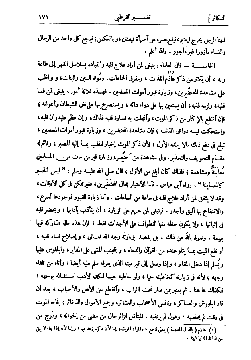 فبينا الرجل يحرج لِيَعْتَبِرَ، فَيَقَعُ بَصَرُهُ عَلَى امْرَأَةٍ فَيُفْتَتَنُ، وَبِالْعَكْسِ فَيَرْجِعُ كُلُّ وَاحِدٍ مِنَ الرِّجَالِ وَالنِّسَاءِ مَأْزُورًا غَيْرَ مَأْجُورٍ. وَاللَّهُ أَعْلَمُ. الْخَامِسَةُ: قَالَ الْعُلَمَاءُ: يَنْبَغِي لِمَنْ أَرَادَ عِلَاجَ قَلْبِهِ وَانْقِيَادِهِ بِسَلَاسِلِ الْقَهْرِ إِلَى طَاعَةِ رَبِّهِ، أَنْ يُكْثِرَ مِنْ ذِكْرِ هَاذِمِ «١» اللَّذَّاتِ، وَمُفَرِّقِ الْجَمَاعَاتِ، وَمُوتِمِ الْبَنِينَ وَالْبَنَاتِ، وَيُوَاظِبُ عَلَى مُشَاهَدَةِ الْمُحْتَضَرِينَ، وَزِيَارَةِ قُبُورِ أَمْوَاتِ الْمُسْلِمِينَ. فَهَذِهِ ثَلَاثَةُ أُمُورٍ، يَنْبَغِي لِمَنْ قَسَا قَلْبُهُ، وَلَزِمَهُ ذَنْبُهُ، أَنْ يَسْتَعِينَ بِهَا عَلَى دَوَاءِ دَائِهِ، وَيَسْتَصْرِخُ بِهَا عَلَى فِتَنِ الشَّيْطَانِ وَأَعْوَانِهِ، فَإِنِ انْتَفَعَ بِالْإِكْثَارِ مِنْ ذِكْرِ الْمَوْتِ، وَانْجَلَتْ بِهِ قَسَاوَةُ قَلْبِهِ فَذَاكَ، وَإِنْ عَظُمَ عَلَيْهِ رَانُ قَلْبِهِ، وَاسْتَحْكَمَتْ فِيهِ دَوَاعِي الذَّنْبِ، فَإِنَّ مُشَاهَدَةَ الْمُحْتَضَرِينَ، وَزِيَارَةَ قُبُورِ أَمْوَاتِ الْمُسْلِمِينَ، تَبْلُغُ فِي دَفْعِ ذَلِكَ مَا لَا يَبْلُغُهُ الْأَوَّلُ، لِأَنَّ ذِكْرَ الْمَوْتِ إِخْبَارٌ لِلْقَلْبِ بِمَا إِلَيْهِ الْمَصِيرُ، وَقَائِمٌ لَهُ مَقَامَ التَّخْوِيفِ وَالتَّحْذِيرِ. وَفِي مُشَاهَدَةِ مَنِ احْتُضِرَ، وَزِيَارَةِ قَبْرِ مَنْ مَاتَ مِنَ الْمُسْلِمِينَ مُعَايَنَةٌ وَمُشَاهَدَةٌ، فَلِذَلِكَ كَانَ أَبْلَغَ مِنَ الْأَوَّلِ، قَالَ صَلَّى اللَّهُ عَلَيْهِ وَسَلَّمَ: (لَيْسَ الْخَبَرُ كَالْمُعَايَنَةِ) رَوَاهُ ابْنُ عَبَّاسٍ. فَأَمَّا الِاعْتِبَارُ بِحَالِ الْمُحْتَضَرِينَ، فَغَيْرُ مُمْكِنٍ فِي كُلِّ الْأَوْقَاتِ، وَقَدْ لَا يَتَّفِقُ لِمَنْ أَرَادَ عِلَاجَ قَلْبِهِ فِي سَاعَةٍ مِنَ السَّاعَاتِ. وَأَمَّا زِيَارَةُ الْقُبُورِ فَوُجُودُهَا أَسْرَعُ، وَالِانْتِفَاعُ بِهَا أَلْيَقُ وَأَجْدَرُ. فَيَنْبَغِي لِمَنْ عَزَمَ عَلَى الزِّيَارَةِ، أَنْ يَتَأَدَّبَ بِآدَابِهَا، وَيُحْضِرَ قَلْبَهُ فِي إِتْيَانِهَا، وَلَا يَكُونَ حَظُّهُ مِنْهَا التَّطْوَافُ عَلَى الْأَجْدَاثِ فَقَطْ، فَإِنَّ هَذِهِ حَالَةٌ تُشَارِكُهُ فِيهَا بَهِيمَةٌ. وَنَعُوذُ بِاللَّهِ مِنْ ذَلِكَ. بَلْ يَقْصِدُ بِزِيَارَتِهِ وَجْهَ اللَّهِ تَعَالَى، وَإِصْلَاحِ فَسَادِ قَلْبِهِ، أَوْ نَفْعِ الْمَيِّتِ بِمَا يَتْلُو عِنْدَهُ مِنَ الْقُرْآنِ وَالدُّعَاءِ، وَيَتَجَنَّبُ الْمَشْيَ عَلَى الْمَقَابِرِ، وَالْجُلُوسَ عَلَيْهَا وَيُسَلِّمُ إِذَا دَخَلَ الْمَقَابِرَ وَإِذَا وَصَلَ إِلَى قَبْرِ مَيِّتِهِ الَّذِي يَعْرِفُهُ سَلَّمَ عَلَيْهِ أَيْضًا، وَأَتَاهُ مِنْ تِلْقَاءِ وَجْهِهِ، لِأَنَّهُ فِي زِيَارَتِهِ كَمُخَاطَبَتِهِ حَيًّا، وَلَوْ خَاطَبَهُ حَيًّا لَكَانَ الْأَدَبُ استقباله بوجهه، فكذلك ها هنا. ثُمَّ يَعْتَبِرُ بِمَنْ صَارَ تَحْتَ التُّرَابِ، وَانْقَطَعَ عَنِ الْأَهْلِ وَالْأَحْبَابِ، بَعْدَ أَنْ قَادَ الْجُيُوشَ وَالْعَسَاكِرَ، وَنَافَسَ الْأَصْحَابَ وَالْعَشَائِرَ، وَجَمَعَ الْأَمْوَالَ وَالذَّخَائِرَ، فَجَاءَهُ الْمَوْتُ فِي وَقْتٍ لَمْ يَحْتَسِبْهُ، وَهَوْلٍ لَمْ يَرْتَقِبْهُ. فَلْيَتَأَمَّلِ الزَّائِرُ حَالَ مَنْ مَضَى من إخوانه، ودرج من
