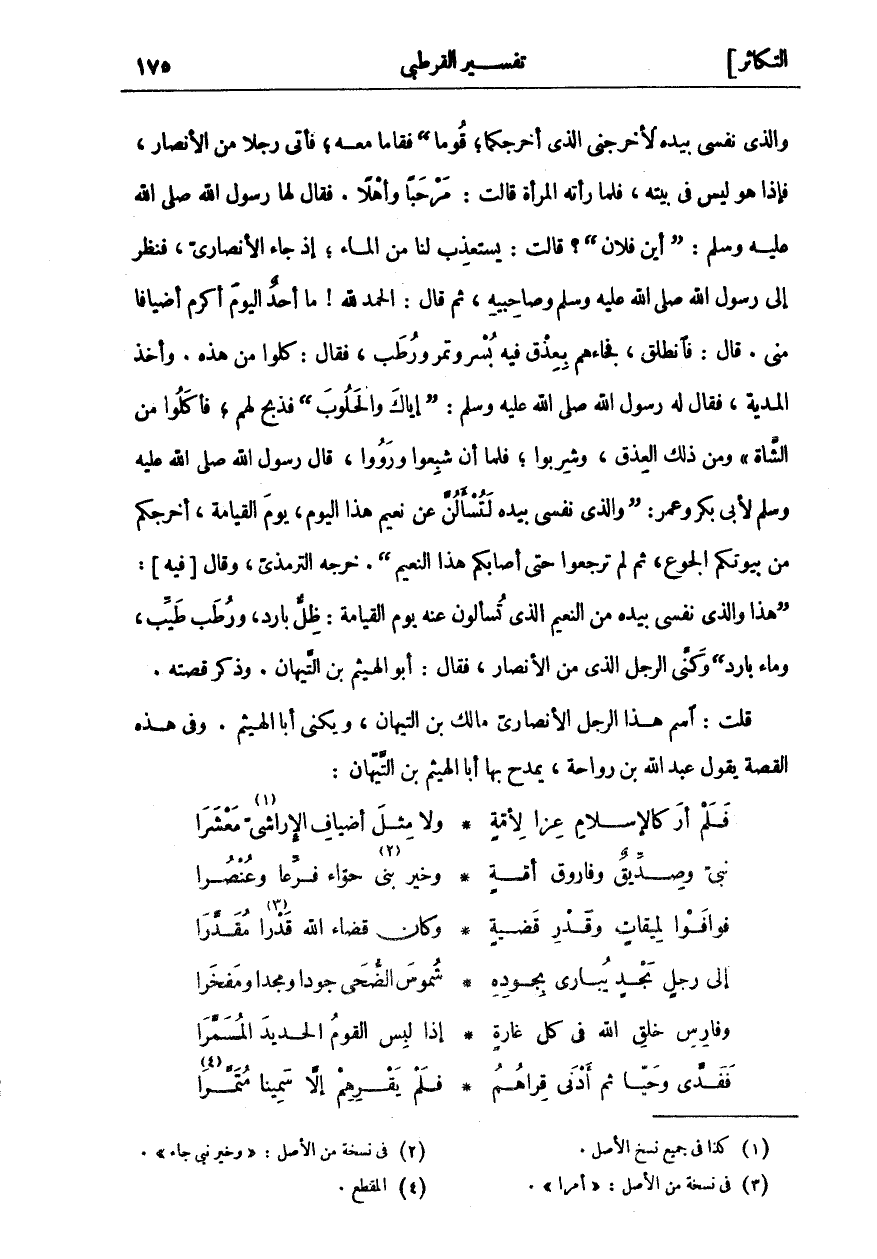 وَالَّذِي نَفْسِي بِيَدِهِ لَأَخْرَجَنِي الَّذِي أَخْرَجَكُمَا قُومَا) فَقَامَا مَعَهُ، فَأَتَى رَجُلًا مِنْ الْأَنْصَارِ، فَإِذَا هُوَ لَيْسَ فِي بَيْتِهِ، فَلَمَّا رَأَتْهُ الْمَرْأَةُ قَالَتْ: مَرْحَبًا وَأَهْلًا. فَقَالَ لَهَا رَسُولُ اللَّهِ صَلَّى اللَّهُ عَلَيْهِ وَسَلَّمَ: (أَيْنَ فُلَانٌ)؟ قَالَتْ: يَسْتَعْذِبُ لَنَا مِنَ الْمَاءِ، إِذْ جَاءَ الْأَنْصَارِيُّ، فَنَظَرَ إِلَى رَسُولِ اللَّهِ صَلَّى اللَّهُ عَلَيْهِ وَسَلَّمَ وَصَاحِبَيْهِ، ثُمَّ قَالَ: الْحَمْدُ لِلَّهِ! مَا أحد اليوم أكرم إضافيا مِنِّي. قَالَ: فَانْطَلَقَ، فَجَاءَهُمْ بِعِذْقٍ فِيهِ بُسْرٌ وَتَمْرٌ وَرُطَبٌ، فَقَالَ: كُلُوا مِنْ هَذِهِ. وَأَخَذَ الْمُدْيَةَ فَقَالَ لَهُ رَسُولُ اللَّهِ صَلَّى اللَّهُ عَلَيْهِ وَسَلَّمَ: (إِيَّاكَ وَالْحَلُوبَ) فَذَبَحَ لَهُمْ، فَأَكَلُوا مِنَ الشَّاةِ، وَمِنْ ذَلِكَ الْعِذْقِ، وَشَرِبُوا، فَلَمَّا أَنْ شَبِعُوا وَرَوُوا، قَالَ رَسُولُ اللَّهِ صَلَّى اللَّهُ عَلَيْهِ وَسَلَّمَ لِأَبِي بَكْرٍ وَعُمَرَ: (وَالَّذِي نَفْسِي بِيَدِهِ لَتُسْأَلُنَّ عَنْ نَعِيمِ هَذَا الْيَوْمِ، يَوْمَ الْقِيَامَةِ، أَخْرَجَكُمْ مِنْ بُيُوتِكُمُ الْجُوعُ، ثُمَّ لَمْ تَرْجِعُوا حَتَّى أَصَابَكُمْ هَذَا النَّعِيمُ (. خَرَّجَهُ التِّرْمِذِيُّ، وَقَالَ [فِيهِ]:) هَذَا وَالَّذِي نَفْسِي بِيَدِهِ مِنَ النَّعِيمِ الَّذِي تُسْأَلُونَ عَنْهُ يَوْمَ الْقِيَامَةِ: ظِلٌّ بَارِدٌ، وَرُطَبٌ طَيِّبٌ، وَمَاءٌ بَارِدٌ) وَكَنَّى الرَّجُلُ الَّذِي مِنْ الْأَنْصَارِ، فَقَالَ: أَبُو الْهَيْثَمِ ابن التَّيْهَانِ. وَذَكَرَ قِصَّتَهُ. قُلْتُ: اسْمُ هَذَا الرَّجُلِ الْأَنْصَارِيِّ مَالِكُ بْنُ التَّيْهَانِ، وَيُكَنَّى أَبَا الْهَيْثَمِ. وَفِي هَذِهِ الْقِصَّةِ يَقُولُ عَبْدُ اللَّهِ بْنُ رَوَاحَةَ، يَمْدَحُ بِهَا أَبَا الْهَيْثَمِ بْنِ التَّيْهَانَ: