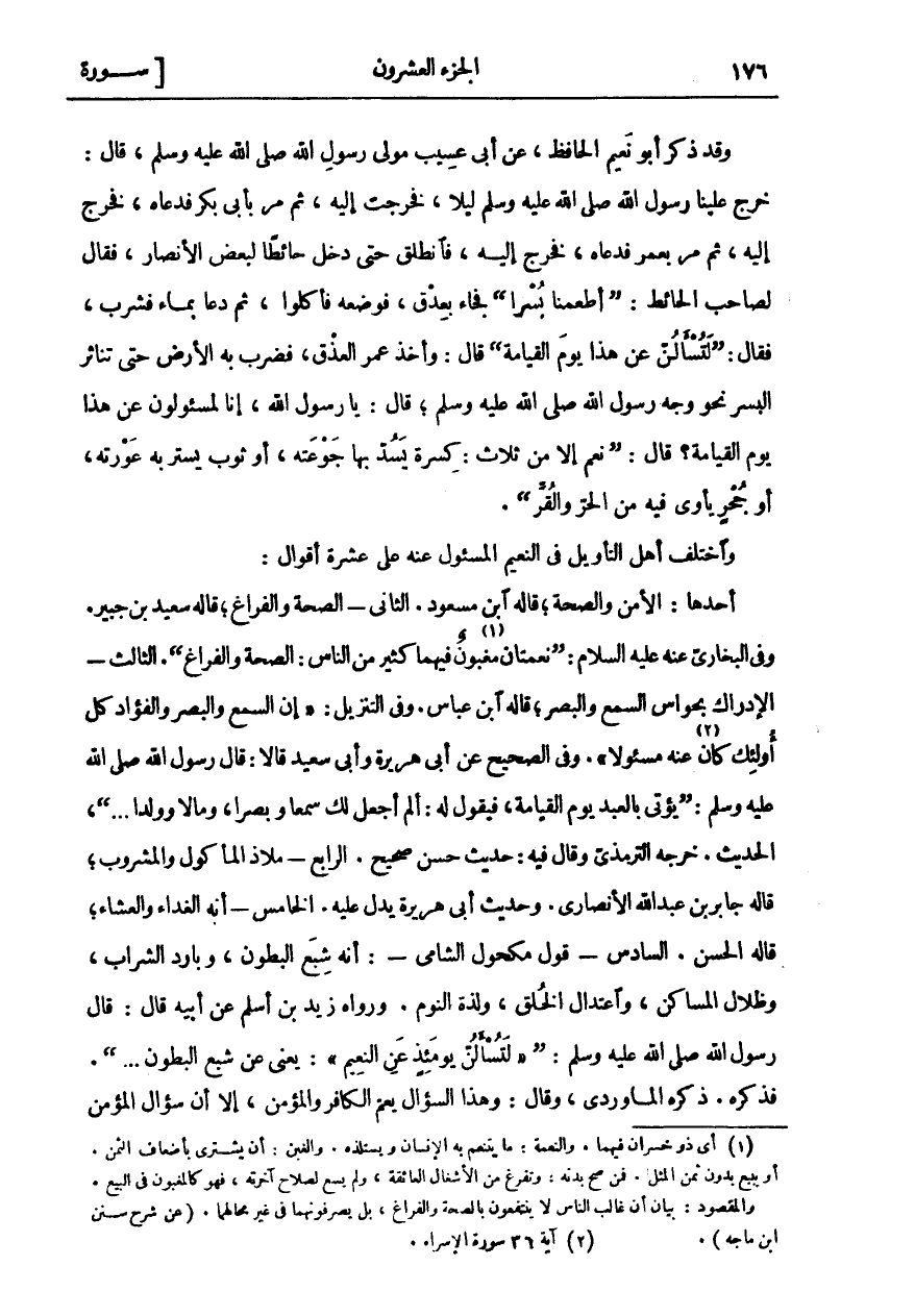 وقد ذكر أبو نعم الْحَافِظُ، عَنْ أَبِي عَسِيبٍ مَوْلَى رَسُولِ اللَّهِ صَلَّى اللَّهُ عَلَيْهِ وَسَلَّمَ، قَالَ: خَرَجَ عَلَيْنَا رَسُولُ اللَّهِ صَلَّى اللَّهُ عَلَيْهِ وَسَلَّمَ لَيْلًا، فَخَرَجْتُ إِلَيْهِ، ثُمَّ مَرَّ بِأَبِي بَكْرٍ فَدَعَاهُ، فَخَرَجَ إِلَيْهِ، ثُمَّ مَرَّ بِعُمَرَ فَدَعَاهُ، فَخَرَجَ إِلَيْهِ، فَانْطَلَقَ حَتَّى دَخَلَ حَائِطًا لِبَعْضِ الْأَنْصَارِ، فَقَالَ لِصَاحِبِ الْحَائِطِ: (أَطْعِمْنَا بُسْرًا) فَجَاءَ بِعِذْقٍ، فَوَضَعَهُ فَأَكَلُوا، ثُمَّ دَعَا بِمَاءٍ فَشَرِبَ، فَقَالَ: (لَتُسْأَلُنَّ عَنْ هَذَا يَوْمَ الْقِيَامَةِ) قَالَ: وَأَخَذَ عُمَرُ الْعِذْقَ، فَضَرَبَ بِهِ الْأَرْضَ حَتَّى تَنَاثَرَ الْبُسْرُ نَحْوَ وَجْهُ رَسُولِ اللَّهِ صَلَّى اللَّهُ عَلَيْهِ وَسَلَّمَ قَالَ: يَا رَسُولَ اللَّهِ، إِنَّا لَمَسْئُولُونَ عَنْ هَذَا يَوْمَ الْقِيَامَةِ؟ قَالَ: (نَعَمْ إِلَّا مِنْ ثَلَاثٍ: كِسْرَةٍ يَسُدُّ بِهَا جَوْعَتَهُ، أَوْ ثَوْبٍ يَسْتُرُ بِهِ عَوْرَتَهُ، أَوْ حَجْرٍ يَأْوِي فِيهِ مِنَ الْحَرِّ وَالْقُرِّ). وَاخْتَلَفَ أَهْلُ التَّأْوِيلِ فِي النَّعِيمِ الْمَسْئُولِ عَنْهُ عَلَى عَشَرَةِ أَقْوَالٍ: أَحَدُهَا: الْأَمْنُ وَالصِّحَّةُ، قَالَهُ ابْنُ مَسْعُودٍ. الثَّانِي- الصِّحَّةُ وَالْفَرَاغُ، قَالَهُ سَعِيدُ بْنُ جُبَيْرٍ. وَفِي الْبُخَارِيِّ عَنْهُ عَلَيْهِ السَّلَامُ: (نِعْمَتَانِ «١» مَغْبُونٌ فِيهِمَا كَثِيرٌ مِنَ النَّاسِ: الصِّحَّةُ وَالْفَرَاغُ). الثَّالِثُ- الْإِدْرَاكُ بِحَوَاسِّ السَّمْعِ وَالْبَصَرِ، قَالَهُ ابْنُ عَبَّاسٍ. وَفِي التَّنْزِيلِ: إِنَّ السَّمْعَ وَالْبَصَرَ وَالْفُؤادَ كُلُّ أُولئِكَ كانَ «٢» عَنْهُ مَسْؤُلًا [الاسراء: ٣٦]. وَفِي الصَّحِيحِ عَنْ أَبِي هُرَيْرَةَ وَأَبِي سَعِيدٍ قَالَا: قَالَ رَسُولُ اللَّهِ صَلَّى اللَّهُ عَلَيْهِ وَسَلَّمَ: (يُؤْتَى بِالْعَبْدِ يَوْمَ الْقِيَامَةِ، فَيَقُولُ لَهُ: أَلَمْ أَجْعَلْ لَكَ سَمْعًا وَبَصَرًا، وَمَالًا وَوَلَدًا ... )، الْحَدِيثَ. خَرَّجَهُ التِّرْمِذِيُّ وَقَالَ فِيهِ: حَدِيثٌ حَسَنٌ صَحِيحٌ. الرَّابِعُ- مَلَاذُّ الْمَأْكُولِ وَالْمَشْرُوبِ قَالَهُ جَابِرُ بْنُ عَبْدِ اللَّهِ الْأَنْصَارِيُّ. وَحَدِيثُ أَبِي هُرَيْرَةَ يَدُلُّ عَلَيْهِ. الْخَامِسُ- أَنَّهُ الْغَدَاءُ وَالْعَشَاءُ، قَالَهُ الْحَسَنُ. السَّادِسُ- قَوْلُ مَكْحُولٍ الشَّامِيِّ-: أَنَّهُ شِبَعُ الْبُطُونِ وَبَارِدُ الشَّرَابِ، وَظِلَالُ الْمَسَاكِنِ، وَاعْتِدَالُ الْخَلْقِ، وَلَذَّةُ النَّوْمِ. وَرَوَاهُ زَيْدُ بْنُ أَسْلَمَ عَنْ أَبِيهِ قَالَ: قَالَ رَسُولُ اللَّهِ صَلَّى اللَّهُ عَلَيْهِ وَسَلَّمَ: (لَتُسْأَلُنَّ يَوْمَئِذٍ عَنِ النَّعِيمِ) يَعْنِي عَنْ شِبَعِ الْبُطُونِ ... (. فَذَكَرَهُ. ذَكَرَهُ الْمَاوَرْدِيُّ، وَقَالَ: وَهَذَا السُّؤَالُ يَعُمُّ الْكَافِرَ وَالْمُؤْمِنَ، إِلَّا أَنَّ سؤال المؤمن