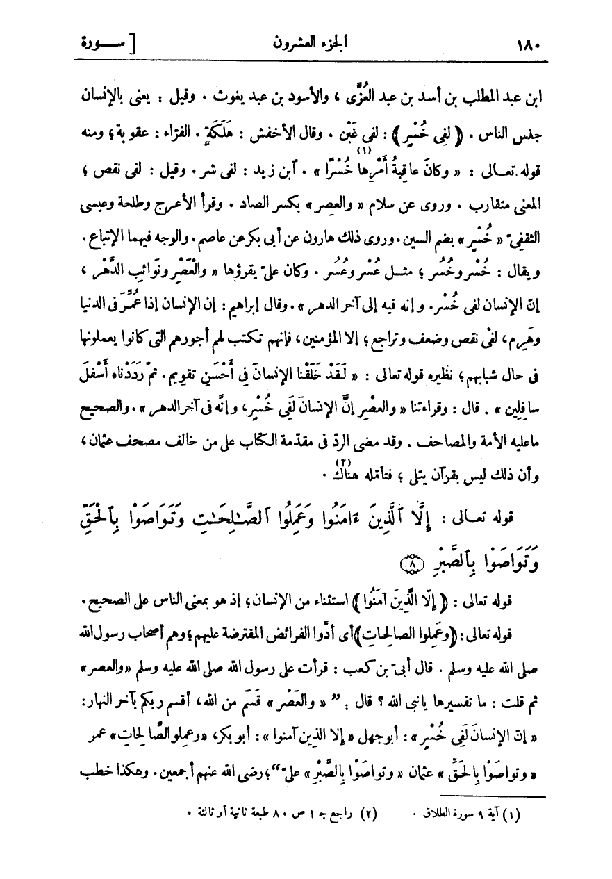 ابن عَبْدِ الْمُطَّلِبِ بْنِ أَسَدِ بْنِ عَبْدِ الْعُزَّى، وَالْأَسْوَدَ بْنَ عَبْدِ يَغُوثَ. وَقِيلَ: يَعْنِي بِالْإِنْسَانِ جِنْسَ النَّاسِ. لَفِي خُسْرٍ: لَفِي غَبْنٍ. وَقَالَ الْأَخْفَشُ: هَلَكَةٍ. الْفَرَّاءُ: عُقُوبَةٍ، وَمِنْهُ قَوْلُهُ تَعَالَى: وَكانَ عاقِبَةُ أَمْرِها «١» خُسْراً [الطلاق: ٩]. ابْنُ زَيْدٍ: لَفِي شَرٍّ. وَقِيلَ: لَفِي نَقْصٍ، الْمَعْنَى مُتَقَارِبٌ. وَرُوِيَ عَنْ سَلَّامٍ (وَالْعَصِرِ) بِكَسْرِ الصَّادِ. وَقَرَأَ الْأَعْرَجُ وَطَلْحَةُ وَعِيسَى الثَّقَفِيُّ (خُسْرٍ) بِضَمِّ السِّينِ. وَرَوَى ذَلِكَ هَارُونُ عَنْ أَبِي بَكْرٍ عَنْ عَاصِمٍ. وَالْوَجْهُ فِيهِمَا الْإِتْبَاعُ. وَيُقَالُ: خُسْرٍ وَخُسُرٍ، مِثْلَ عُسْرٍ وَعُسُرٍ. وَكَانَ عَلِيٌّ يَقْرَؤُهَا وَالْعَصْرِ وَنَوَائِبِ الدَّهْرِ، إِنَّ الْإِنْسانَ لَفِي خُسْرٍ. وَإِنَّهُ فِيهِ إِلَى آخِرِ الدَّهْرِ. وَقَالَ إِبْرَاهِيمُ: إِنَّ الْإِنْسَانَ إِذَا عُمِّرَ فِي الدُّنْيَا وَهَرِمَ، لَفِي نَقْصٍ وَضَعْفٍ وَتَرَاجُعٍ، إِلَّا الْمُؤْمِنِينَ، فَإِنَّهُمْ تُكْتَبُ لَهُمْ أُجُورُهُمُ الَّتِي كَانُوا يَعْمَلُونَهَا فِي حَالِ شَبَابِهِمْ، نَظِيرُهُ قَوْلُهُ تَعَالَى: لَقَدْ خَلَقْنَا الْإِنْسانَ فِي أَحْسَنِ تَقْوِيمٍ. ثُمَّ رَدَدْناهُ أَسْفَلَ سافِلِينَ. [التين: ٥ - ٤]. قَالَ: وَقِرَاءَتُنَا وَالْعَصْرِ إِنَّ الْإِنْسانَ لَفِي خُسْرٍ، وَإِنَّهُ فِي آخِرِ الدَّهْرِ. وَالصَّحِيحُ مَا عَلَيْهِ الْأُمَّةُ وَالْمَصَاحِفُ. وَقَدْ مَضَى الرَّدُّ فِي مُقَدِّمَةِ الْكِتَابِ عَلَى مَنْ خَالَفَ مُصْحَفَ عُثْمَانَ، وَأَنَّ ذلك ليس بقرآن يتلى، فتأمله هناك «٢».