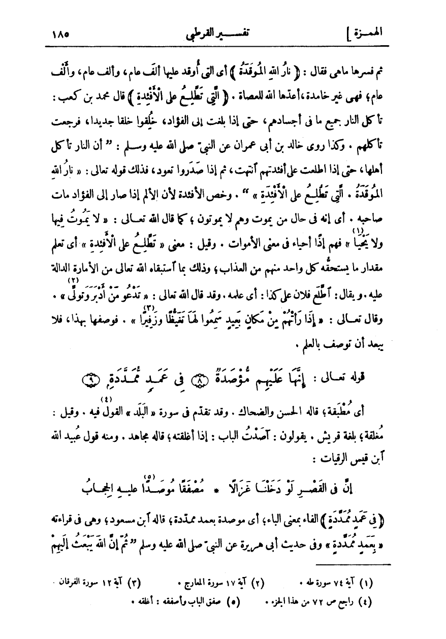 ثم فسرها ما هي فقال: (نارُ اللَّهِ الْمُوقَدَةُ) أَيِ الَّتِي أُوقِدَ عَلَيْهَا أَلْفَ عَامٍ، وَأَلْفَ عَامٍ، وَأَلْفَ عَامٍ، فَهِيَ غَيْرُ خَامِدَةٍ، أَعَدَّهَا اللَّهُ لِلْعُصَاةِ. (الَّتِي تَطَّلِعُ عَلَى الْأَفْئِدَةِ) قَالَ مُحَمَّدُ بْنُ كَعْبٍ: تَأْكُلُ النَّارُ جَمِيعَ مَا فِي أَجْسَادِهِمْ، حَتَّى إِذَا بَلَغَتْ إِلَى الْفُؤَادِ، خُلِقُوا خَلْقًا جَدِيدًا، فَرَجَعَتْ تَأْكُلُهُمْ. وَكَذَا رَوَى خَالِدُ بْنُ أَبِي عِمْرَانَ عَنِ النَّبِيِّ صَلَّى اللَّهُ عَلَيْهِ وَسَلَّمَ: (أَنَّ النَّارَ تَأْكُلُ أَهْلَهَا، حَتَّى إِذَا اطَّلَعَتْ عَلَى أَفْئِدَتِهِمُ انْتَهَتْ، ثُمَّ إِذَا صَدَرُوا تَعُودُ، فَذَلِكَ قَوْلُهُ تَعَالَى: نارُ اللَّهِ الْمُوقَدَةُ. الَّتِي تَطَّلِعُ عَلَى الْأَفْئِدَةِ:. وَخَصَّ الْأَفْئِدَةَ لِأَنَّ الْأَلَمَ إِذَا صَارَ إِلَى الْفُؤَادِ مَاتَ صَاحِبُهُ. أَيْ إِنَّهُ فِي حَالِ مَنْ يَمُوتُ وَهُمْ لَا يَمُوتُونَ، كَمَا قَالَ اللَّهُ تَعَالَى: لَا يَمُوتُ فِيها وَلا يَحْيى»