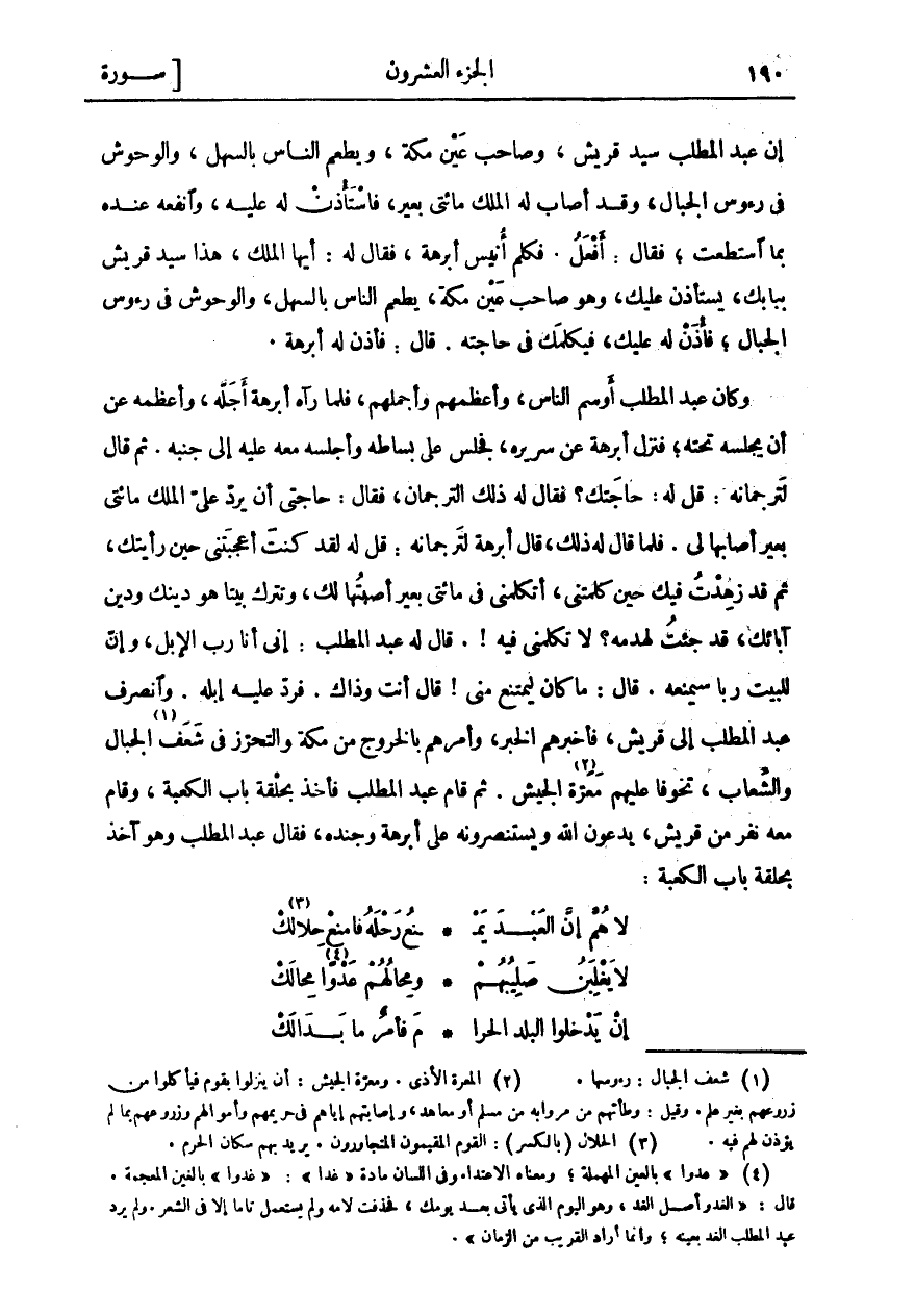 إِنَّ عَبْدَ الْمُطَّلِبِ سَيِّدَ قُرَيْشٍ، وَصَاحِبَ عَيْنِ مَكَّةَ، وَيُطْعِمُ النَّاسَ بِالسَّهْلِ، وَالْوُحُوشَ فِي رُءُوسِ الْجِبَالِ، وَقَدْ أَصَابَ لَهُ الْمَلِكُ مِائَتَيْ بَعِيرٍ، فَاسْتَأْذِنْ لَهُ عَلَيْهِ، وَانْفَعْهُ عِنْدَهُ بِمَا اسْتَطَعْتَ، فَقَالَ: أَفْعَلُ. فَكَلَّمَ أُنَيْسٌ أَبْرَهَةَ، فَقَالَ لَهُ: أَيُّهَا الْمَلِكُ، هَذَا سَيِّدُ قُرَيْشٍ بِبَابِكَ، يَسْتَأْذِنُ عَلَيْكَ، وَهُوَ صَاحِبُ عَيْنِ مَكَّةَ، يُطْعِمُ النَّاسَ بِالسَّهْلِ، وَالْوُحُوشَ فِي رُءُوسِ الْجِبَالِ، فَأْذَنْ لَهُ عَلَيْكَ، فَيُكَلِّمَكَ فِي حَاجَتِهِ. قَالَ: فَأَذِنَ لَهُ أَبْرَهَةُ. وَكَانَ عَبْدُ الْمُطَّلِبِ أَوْسَمَ النَّاسِ، وَأَعْظَمَهُمْ وَأَجْمَلَهُمْ، فَلَمَّا رَآهُ أَبْرَهَةُ أَجَلَّهُ، وَأَعْظَمَهُ عَنْ أَنْ يُجْلِسَهُ تَحْتَهُ، فَنَزَلَ أَبْرَهَةُ عَنْ سَرِيرِهِ، فَجَلَسَ عَلَى بِسَاطِهِ وَأَجْلَسَهُ مَعَهُ عَلَيْهِ إِلَى جَنْبِهِ. ثُمَّ قَالَ لِتُرْجُمَانِهِ: قُلْ لَهُ: حَاجَتُكَ؟ فَقَالَ لَهُ ذَلِكَ التُّرْجُمَانُ، فَقَالَ: حَاجَتِي أَنْ يَرُدَّ عَلَيَّ الْمَلِكُ مِائَتَيْ بَعِيرٍ أَصَابَهَا لِي. فَلَمَّا قَالَ لَهُ ذَلِكَ، قَالَ أَبْرَهَةُ لِتُرْجُمَانِهِ: قُلْ لَهُ لَقَدْ كُنْتُ أَعْجَبْتنِي حِينَ رَأَيْتُكَ، ثُمَّ قَدْ زَهِدْتُ فِيكَ حِينَ كَلَّمْتَنِي، أَتُكَلِّمُنِي فِي مِائَتَيْ بَعِيرٍ أَصَبْتُهَا لَكَ، وَتَتْرُكُ بَيْتًا هُوَ دِينُكَ وَدِينُ آبَائِكَ، قَدْ جِئْتُ لِهَدْمِهِ؟ لَا تُكَلِّمُنِي فِيهِ! قَالَ لَهُ عَبْدُ الْمُطَّلِبِ: إِنِّي أَنَا رَبُّ الْإِبِلِ، وَإِنَّ لِلْبَيْتِ رَبًّا سَيَمْنَعُهُ. قَالَ: مَا كَانَ لِيَمْتَنِعَ مِنِّي! قَالَ أَنْتَ وَذَاكَ. فَرَدَّ عَلَيْهِ إِبِلَهُ. وَانْصَرَفَ عَبْدُ الْمُطَّلِبِ إِلَى قُرَيْشٍ، فَأَخْبَرَهُمُ الْخَبَرَ، وَأَمَرَهُمْ بِالْخُرُوجِ مِنْ مَكَّةَ وَالتَّحَرُّزِ فِي شَعَفِ «١» الْجِبَالِ وَالشِّعَابِ، تَخَوُّفًا عَلَيْهِمْ مَعَرَّةَ «٢» الْجَيْشِ. ثُمَّ قَامَ عَبْدُ الْمُطَّلِبِ فَأَخَذَ بِحَلْقَةِ بَابِ الْكَعْبَةِ، وَقَامَ مَعَهُ نَفَرٌ مِنْ قُرَيْشٍ، يَدْعُونَ اللَّهَ وَيَسْتَنْصِرُونَهُ عَلَى أَبْرَهَةَ وَجُنْدِهِ، فَقَالَ عَبْدُ الْمُطَّلِبِ وَهُوَ آخِذٌ بِحَلْقَةِ بَابِ الْكَعْبَةِ: