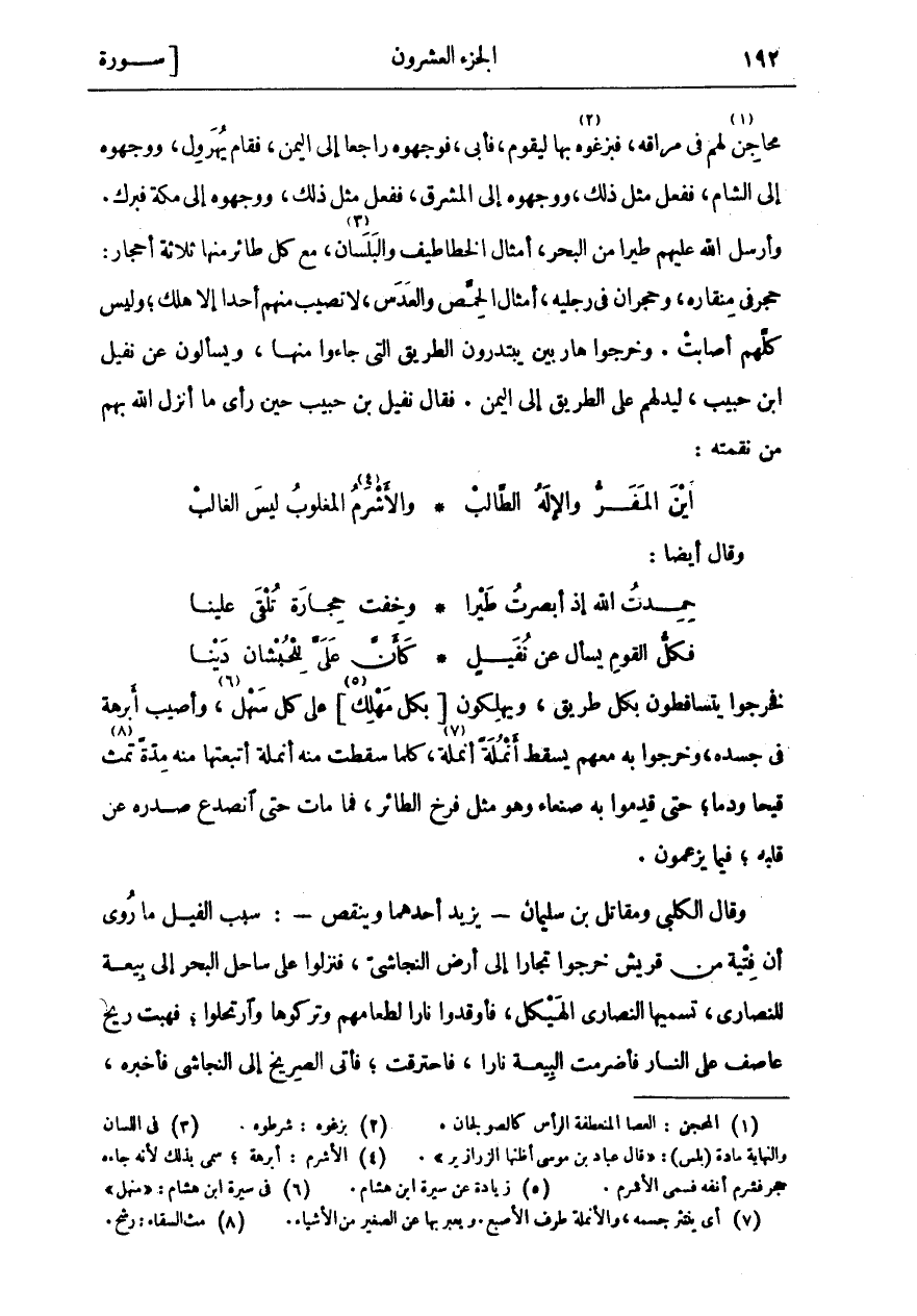 مَحَاجِنَ «١» لَهُمْ فِي مَرَاقِّهِ، فَبَزَغُوهُ «٢» بِهَا لِيَقُومَ، فَأَبَى، فَوَجَّهُوهُ رَاجِعًا إِلَى الْيَمَنِ، فَقَامَ يُهَرْوِلُ وَوَجَّهُوهُ إِلَى الشَّامِ، فَفَعَلَ مِثْلَ ذَلِكَ، وَوَجَّهُوهُ إِلَى الْمَشْرِقِ، فَفَعَلَ مِثْلَ ذَلِكَ، وَوَجَّهُوهُ إِلَى مَكَّةَ فَبَرَكَ. وَأَرْسَلَ اللَّهُ عَلَيْهِمْ طَيْرًا مِنَ الْبَحْرِ، أَمْثَالَ الْخَطَاطِيفِ وَالْبَلَسَانِ «٣»، مَعَ كُلِّ طَائِرٍ مِنْهَا ثَلَاثَةُ أَحْجَارٍ: حَجَرٌ فِي مِنْقَارِهِ، وَحَجَرَانِ فِي رِجْلَيْهِ، أَمْثَالَ الْحِمَّصِ وَالْعَدَسِ، لَا تُصِيبُ مِنْهُمْ أَحَدًا إِلَّا هَلَكَ، وَلَيْسَ كُلَّهُمْ أَصَابَتْ. وَخَرَجُوا هَارِبِينَ يَبْتَدِرُونَ الطَّرِيقَ الَّتِي جَاءُوا مِنْهَا، ويسألون عن نفيل ابن حَبِيبٍ، لِيَدُلَّهُمْ عَلَى الطَّرِيقِ إِلَى الْيَمَنِ. فَقَالَ نُفَيْلُ بْنُ حَبِيبٍ حِينَ رَأَى مَا أَنْزَلَ اللَّهُ بِهِمْ مِنْ نِقْمَتِهِ: