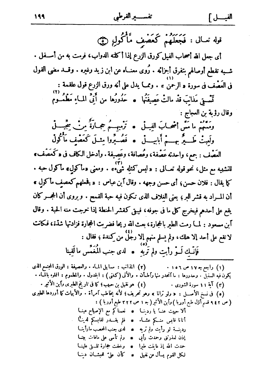 الْعَصْفُ: جَمْعٌ، وَاحِدَتُهُ عَصْفَةٌ وَعُصَافَةٌ، وَعَصِيفَةٌ. وَأَدْخَلَ الْكَافَ فِي كَعَصْفٍ لِلتَّشْبِيهِ مَعَ مِثْلِ، نَحْوَ قَوْلِهِ تَعَالَى: لَيْسَ كَمِثْلِهِ شَيْءٌ «٣» [الشورى: ١١]. وَمَعْنَى مَأْكُولٍ مَأْكُولٌ حَبُّهُ. كَمَا يُقَالُ: فُلَانٌ حَسَنٌ، أَيْ حَسَنٌ وَجْهُهُ. وَقَالَ ابْنُ عَبَّاسٍ: فَجَعَلَهُمْ كَعَصْفٍ مَأْكُولٍ أَنَّ الْمُرَادَ بِهِ قِشْرُ الْبُرِّ، يَعْنِي الْغِلَافَ الَّذِي تَكُونُ فِيهِ حَبَّةُ الْقَمْحِ. وَيُرْوَى أَنَّ الْحَجَرَ كَانَ يَقَعُ عَلَى أَحَدِهِمْ فَيُخْرِجُ كُلَّ مَا فِي جَوْفِهِ، فَيَبْقَى كَقِشْرِ الْحِنْطَةِ إِذَا خَرَجَتْ مِنْهُ الْحَبَّةُ. وَقَالَ ابْنُ مَسْعُودٍ: لَمَّا رَمَتِ الطَّيْرُ بِالْحِجَارَةِ، بَعَثَ اللَّهُ رِيحًا فَضَرَبَتِ الْحِجَارَةَ فَزَادَتْهَا شِدَّةً، فَكَانَتْ لَا تَقَعُ عَلَى أَحَدٍ إِلَّا هَلَكَ، وَلَمْ يَسْلَمْ مِنْهُمْ إِلَّا رَجُلٌ «٤» مِنْ كِنْدَةَ، فَقَالَ: