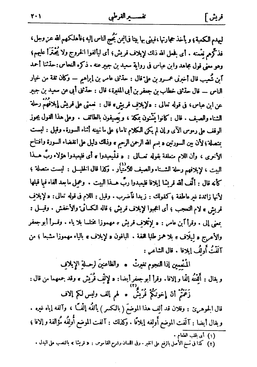 أَيْ فَلْيَعْبُدُوا هَؤُلَاءِ رَبَّ هَذَا الْبَيْتِ، لِإِيلَافِهِمْ رِحْلَةَ الشِّتَاءِ وَالصَّيْفِ لِلِامْتِيَارِ «١». وَكَذَا قَالَ الْخَلِيلُ: لَيْسَتْ مُتَّصِلَةً، كَأَنَّهُ قَالَ: أَلَّفَ اللَّهُ قُرَيْشًا إِيلَافًا فَلْيَعْبُدُوا رَبَّ هَذَا الْبَيْتِ. وَعَمِلَ مَا بَعْدَ الْفَاءِ فِيمَا قَبْلَهَا لِأَنَّهَا زَائِدَةٌ غَيْرُ عَاطِفَةٍ، كَقَوْلِكَ: زَيْدًا فَاضْرِبْ. وَقِيلَ: اللَّامُ فِي قَوْلِهِ تَعَالَى: لِإِيلافِ قُرَيْشٍ لَامُ التَّعَجُّبِ، أَيِ اعْجَبُوا لِإِيلَافِ قُرَيْشٍ، قَالَهُ الْكِسَائِيُّ وَالْأَخْفَشُ. وَقِيلَ: بمعنى إلى. وقرا ابن عامر: لِإِيلافِ قُرَيْشٍ مَهْمُوزًا مُخْتَلَسًا بِلَا يَاءٍ. وَقَرَأَ أَبُو جَعْفَرٍ وَالْأَعْرَجُ" لِيلَافِ" بِلَا هَمْزٍ طَلَبًا لِلْخِفَّةِ. الْبَاقُونَ لِإِيلافِ بِالْيَاءِ مَهْمُوزًا مُشْبَعًا، مِنْ آلَفْتُ أؤلف إِيلَافًا. قَالَ الشَّاعِرُ: