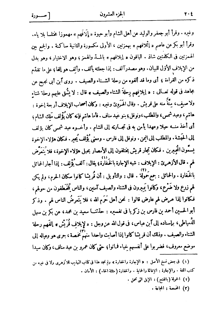 وَغَيْرِهِ. وَقَرَأَ أَبُو جَعْفَرٍ وَالْوَلِيدُ عَنْ أَهْلِ الشَّامِ وَأَبُو حَيْوَةَ" إِلَافِهِمْ" مَهْمُوزًا مُخْتَلَسًا بِلَا ياء. وقرا أبو بكر عن عاصم (إيلافهم) بِهَمْزَتَيْنِ، الْأُولَى مَكْسُورَةٍ وَالثَّانِيَةِ سَاكِنَةٍ. وَالْجَمْعُ بَيْنَ الْهَمْزَتَيْنِ فِي الْكَلِمَتَيْنِ شَاذٌّ. الْبَاقُونَ إِيلافِهِمْ بِالْمَدِّ وَالْهَمْزِ، وَهُوَ الِاخْتِيَارُ، وَهُوَ بَدَلٌ مِنَ الْإِيلَافِ الْأَوَّلِ لِلْبَيَانِ. وَهُوَ مَصْدَرُ آلَفَ: إِذَا جَعَلْتَهُ يَأْلَفُ. وَأَلِفَ هُوَ إِلْفًا، عَلَى مَا تَقَدَّمَ ذِكْرُهُ مِنَ الْقِرَاءَةِ، أَيْ وَمَا قَدْ أَلِفُوهُ مِنْ رِحْلَةِ الشِّتَاءِ وَالصَّيْفِ. رَوَى ابْنِ أَبِي نَجِيحٍ عَنْ مُجَاهِدٍ فِي قَوْلِهِ تَعَالَى: إِيلافِهِمْ رِحْلَةَ الشِّتاءِ وَالصَّيْفِ قَالَ: لَا يَشُقُّ عَلَيْهِمْ رِحْلَةُ شِتَاءٍ وَلَا صَيْفٍ، مِنَّةً مِنْهُ عَلَى قُرَيْشٍ. وَقَالَ الْهَرَوِيُّ وَغَيْرُهُ: وَكَانَ أَصْحَابُ الْإِيلَافِ أَرْبَعَةَ إِخْوَةٍ: هَاشِمٌ، وَعَبْدُ شَمْسٍ، وَالْمُطَّلِبُ، وَنَوْفَلٌ، بَنُو عَبْدِ مَنَافٍ. فَأَمَّا هَاشِمٌ فَإِنَّهُ كَانَ يُؤْلِفُ مَلِكَ الشَّامِ، أَيْ أَخَذَ مِنْهُ حَبْلًا وَعَهْدًا يَأْمَنُ بِهِ فِي تِجَارَتِهِ إِلَى الشَّامِ. وَأَخُوهُ عَبْدُ شَمْسٍ كَانَ يُؤْلِفُ إِلَى الْحَبَشَةِ. وَالْمُطَّلِبُ إِلَى الْيَمَنِ. وَنَوْفَلٌ إِلَى فَارِسَ. وَمَعْنَى يُؤْلِفُ يُجِيرُ. فَكَانَ هَؤُلَاءِ الْإِخْوَةُ يُسَمَّوْنَ الْمُجِيرِينَ. فَكَانَ تُجَّارُ قُرَيْشٍ يَخْتَلِفُونَ إِلَى الْأَمْصَارِ بِحَبْلِ هؤلاء الاخوة، فلا يتعرض لهم. قال الأزهري: الْإِيلَافُ: شَبَّهَ الْإِجَارَةَ بِالْخَفَارَةِ «١»، يُقَالُ: آلَفَ يُؤْلِفُ: إِذَا أَجَارَ الْحَمَائِلَ بِالْخَفَارَةِ. وَالْحَمَائِلُ: جَمْعُ حَمُولَةٍ «٢». قَالَ: وَالتَّأْوِيلُ: أَنَّ قُرَيْشًا كَانُوا سُكَّانَ الْحَرَمِ، وَلَمْ يَكُنْ لَهُمْ زَرْعٌ وَلَا ضَرْعٌ، وَكَانُوا يَمِيرُونَ فِي الشِّتَاءِ وَالصَّيْفِ آمِنِينَ، وَالنَّاسِ يُتَخَطَّفُونَ مِنْ حَوْلِهِمْ، فَكَانُوا إِذَا عَرَضَ لَهُمْ عَارِضٌ قَالُوا: نَحْنُ أَهْلُ حَرَمِ اللَّهِ، فَلَا يَتَعَرَّضُ النَّاسُ لَهُمْ. وَذَكَرَ أَبُو الْحُسَيْنِ أَحْمَدُ بْنُ فَارِسِ بْنِ زَكَرِيَّا فِي تَفْسِيرِهِ: حَدَّثَنَا سَعِيدُ بْنُ مُحَمَّدٍ، عَنْ بَكْرِ بْنِ سَهْلٍ الدِّمْيَاطِيِّ، بِإِسْنَادِهِ إِلَى ابْنِ عَبَّاسٍ، فِي قَوْلِ اللَّهِ عَزَّ وَجَلَّ: لِإِيلافِ قُرَيْشٍ إلفهم رِحْلَةَ الشِّتَاءِ وَالصَّيْفِ. وَذَلِكَ أَنَّ قُرَيْشًا كَانُوا إِذَا أَصَابَتْ وَاحِدًا مِنْهُمْ «٣» مَخْمَصَةٌ، جَرَى هُوَ وَعِيَالُهُ إِلَى مَوْضِعٍ مَعْرُوفٍ، فَضَرَبُوا عَلَى أَنْفُسِهِمْ خِبَاءً فَمَاتُوا، حَتَّى كَانَ عَمْرُو بْنُ عَبْدِ مناف، وكان سيدا