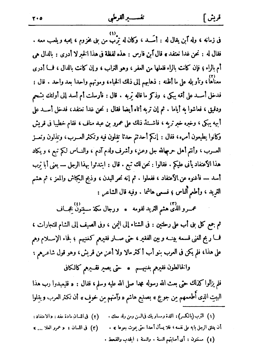 في زَمَانِهِ، وَلَهُ ابْنٌ يُقَالُ لَهُ أَسَدٌ، وَكَانَ لَهُ تِرْبٌ «١» مِنْ بَنِي مَخْزُومٍ، يُحِبُّهُ وَيَلْعَبُ مَعَهُ. فَقَالَ لَهُ: نَحْنُ غَدًا نَعْتَفِدُ، قَالَ ابْنُ فَارِسٍ: هَذِهِ لَفْظَةٌ فِي هَذَا الْخَبَرِ لَا أَدْرِي: بِالدَّالِ هِيَ أَمْ بِالرَّاءِ، فَإِنْ كَانَتْ بِالرَّاءِ فَلَعَلَّهَا مِنَ الْعَفْرِ، وَهُوَ التُّرَابُ، وإن كان بِالدَّالِ، فَمَا أَدْرِي مَعْنَاهَا «٢»، وَتَأْوِيلُهُ عَلَى مَا أَظُنُّهُ: ذَهَابُهُمْ إِلَى ذَلِكَ الْخِبَاءِ، وَمَوْتُهُمْ وَاحِدًا بَعْدَ وَاحِدٍ. قَالَ: فَدَخَلَ أَسَدٌ عَلَى أُمِّهِ يَبْكِي، وَذَكَرَ مَا قَالَهُ تِرْبُهُ. قَالَ: فَأَرْسَلَتْ أُمُّ أَسَدٍ إِلَى أُولَئِكَ بِشَحْمٍ وَدَقِيقٍ، فَعَاشُوا بِهِ أَيَّامًا. ثُمَّ إِنَّ تِرْبَهُ أَتَاهُ أَيْضًا فَقَالَ: نَحْنُ غَدًا نَعْتَفِدُ، فَدَخَلَ أَسَدٌ عَلَى أَبِيهِ يَبْكِي، وَخَبَّرَهُ خَبَرَ تِرْبِهِ، فَاشْتَدَّ ذَلِكَ عَلَى عَمْرِو بْنِ عَبْدِ مَنَافٍ، فَقَامَ خَطِيبًا فِي قُرَيْشٍ وَكَانُوا يُطِيعُونَ أَمْرَهُ، فَقَالَ: إِنَّكُمْ أَحْدَثْتُمْ حَدَثًا تَقِلُّونَ فِيهِ وَتَكْثُرُ الْعَرَبُ، وَتَذِلُّونَ وتعز العرب، وأنتم أهل حرم الله عز وجل، وَأَشْرَفُ وَلَدِ آدَمَ، وَالنَّاسُ لَكُمْ تَبَعٌ، وَيَكَادُ هَذَا الِاعْتِفَادُ يَأْتِي عَلَيْكُمْ. فَقَالُوا: نَحْنُ لَكَ تبع. قال: ابتدءوا بِهَذَا الرَّجُلِ- يَعْنِي أَبَا تِرْبِ أَسَدٍ- فَأَغْنُوهُ عَنِ الِاعْتِفَادِ، فَفَعَلُوا. ثُمَّ إِنَّهُ نَحَرَ الْبُدْنَ، وَذَبَحَ الْكِبَاشَ وَالْمَعْزَ، ثُمَّ هَشَّمَ الثَّرِيدَ، وَأَطْعَمَ النَّاسَ، فَسُمِّيَ هَاشِمًا. وَفِيهِ قَالَ الشَّاعِرُ: