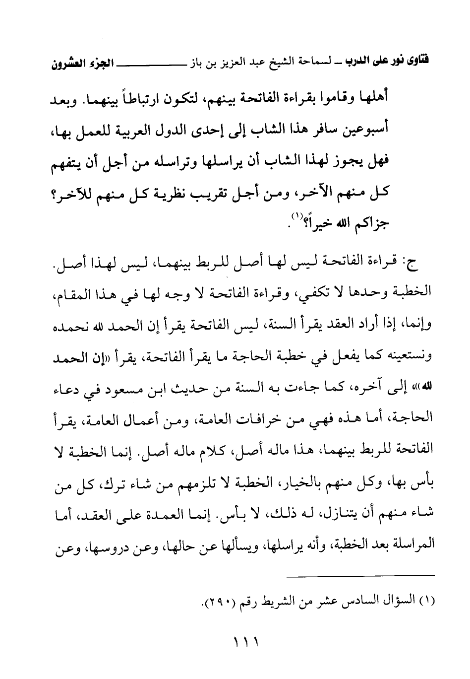 ج: قراءة الفاتحة ليس لها أصل للربط بينهما، ليس لهذا أصل. الخطبة وحدها لا تكفي، وقراءة الفاتحة لا وجه لها في هذا المقام، وإنما، إذا أراد العقد يقرأ السنة، ليس الفاتحة يقرأ إن الحمد لله نحمده ونستعينه كما يفعل في خطبة الحاجة ما يقرأ الفاتحة، يقرأ "إن الحمد لله" إلى آخره، كما جاءت به السنة من حديث ابن مسعود في دعاء الحاجة، أما هذه فهي من خرافات العامة، ومن أعمال العامة، يقرأ الفاتحة للربط بينهما، هذا ما له أصل، كلام ما له أصل. إنما الخطبة لا بأس بها، وكل منهم بالخيار، الخطبة لا تلزمهم من شاء ترك، كل من شاء منهم أن يتنازل، له ذلك، لا بأس. إنما العمدة على العقد، أما المراسلة بعد الخطبة، وأنه يراسلها، ويسألها عن حالها، وعن دروسها، وعن