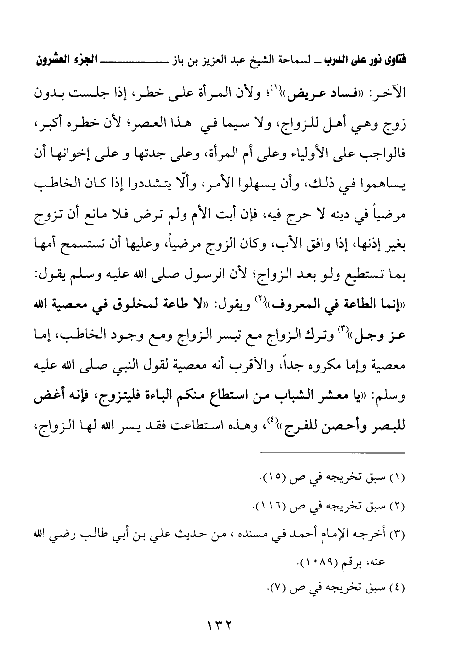 الآخر: «فساد عريض» (¬1)؛ ولأن المرأة على خطر، إذا جلست بدون زوج وهي أهل للزواج، ولا سيما في هذا العصر؛ لأن خطره أكبر، فالواجب على الأولياء وعلى أم المرأة، وعلى جدتها وعلى أخوانها أن يساهموا في ذلك، وأن يسهلوا الأمر، وألاّ يتشددوا إذا كان الخاطب مرضيًا في دينه لا حرج فيه، فإن أبت الأم ولم ترض فلا مانع أن تزوج بغير إذنها، إذا وافق الأب، وكان الزوج مرضيًا، وعليها أن تستسمح أمها بما تستطيع ولو بعد الزواج؛ لأن الرسول صلى الله عليه وسلم يقول: «إنما الطاعة في المعروف» (¬2) ويقول: «لا طاعة لمخلوق في معصية الله عز وجل» (¬3) وترك الزواج مع تيسر الزواج ومع وجود الخاطب، إما معصية وإما مكروه جدًا، والأقرب أنه معصية لقول النبي صلى الله عليه وسلم: «يا معشر الشباب من استطاع منكم الباءة فليتزوج، فإنه أغض للبصر وأحصن للفرج» (¬4) وهذه استطاعت فقد يسر الله لها الزواج،