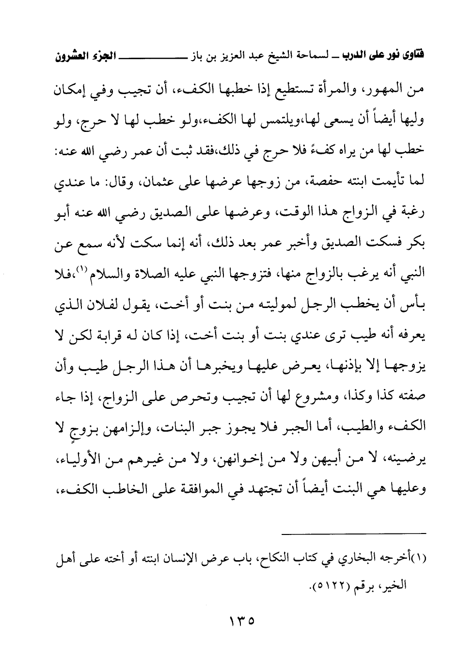 من المهور، والمرأة تستطيع إذا خطبها الكفء، أن تجيب وفي إمكان وليها أيضًا أن يسعى لها، ويلتمس لها الكفء، ولو خطب لها لا حرج، ولو خطب لها من يراه كفء، فلا حرج في ذلك، فقد ثبت «أن عمر رضي الله عنه: لما تأيمت ابنته حفصة، من زوجها عرضها على عثمان، وقال: ما عندي رغبة في الزواج هذا الوقت، وعرضها على الصديق رضي الله عنه أبو بكر فسكت الصديق وأخبر عمر بعد ذلك، أنه إنما سكت؛ لأنه سمع عن النبي أنه يرغب بالزواج منها، فتزوجها النبي عليه الصلاة والسلام» (¬1) فلا بأس أن يخطب الرجل لموليته من بنت أو أخت، يقول لفلان الذي يعرفه أنه طيب ترى عندي بنت أو بنت أخت، إذا كان له قرابة لكن لا يزوجها إلا بإذنها، يعرض عليها ويخبرها أن هذا الرجل طيب وأن صفته كذا وكذا، ومشروع لها أن تجيب وتحرص على الزواج، إذا جاء الكفء، والطيب، أما الجبر فلا يجوز جبر البنات، وإلزامهن بزوجٍ لا يرضينه، لا من أبيهن ولا من إخوانهن، ولا من غيرهم من الأولياء، وعليها هي البنت أيضًا أن تجتهد في الموافقة على الخاطب الكفء،