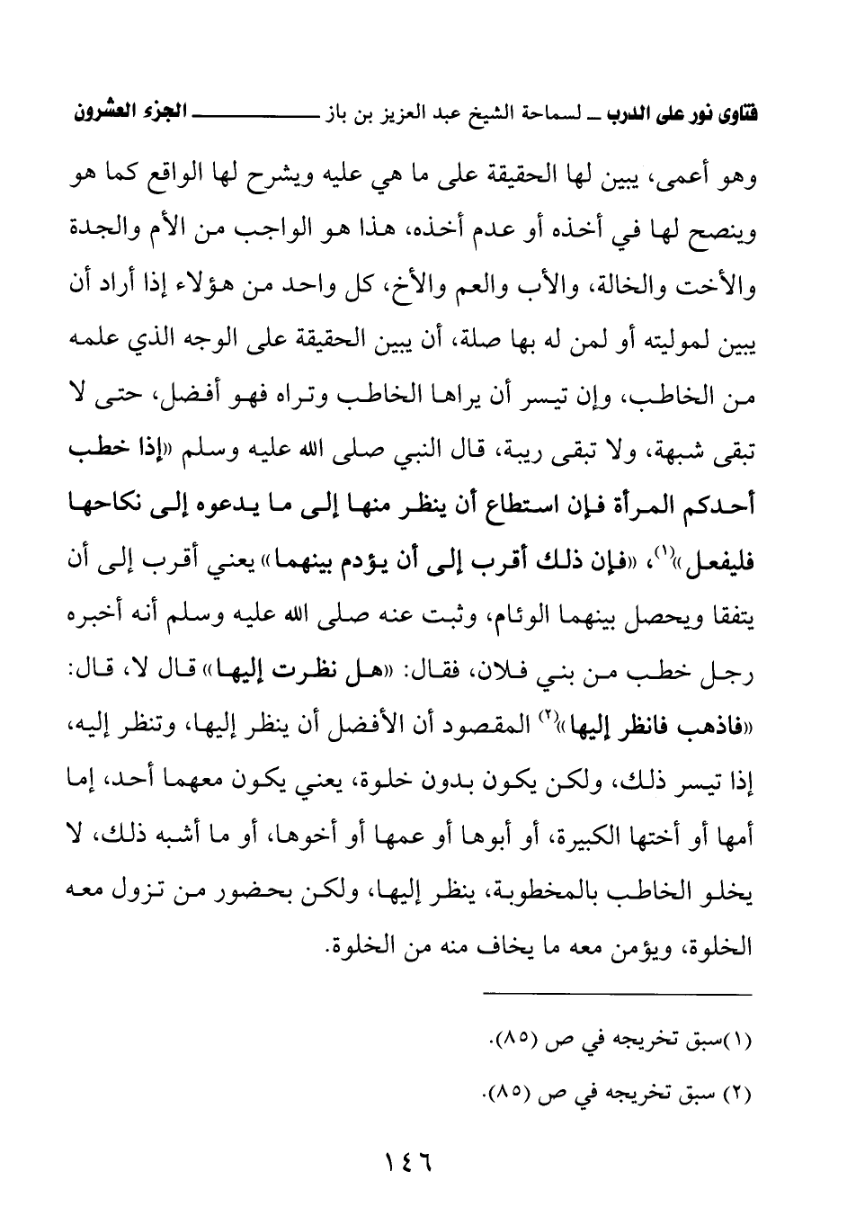وهو أعمى، يبين لها الحقيقة على ما هي عليه ويشرح لها الواقع كما هو وينصح لها في أخذه أو عدم أخذه، هذا هو الواجب من الأم والجدة والأخت والخالة، والأب والعم والأخ، كل واحد من هؤلاء إذا أراد أن يبين لموليته أو لمن له بها صلة، أن يبين الحقيقة على الوجه الذي علمه من الخاطب، وإن تيسر أن يراها الخاطب وتراه فهو أفضل، حتى لا تبقى شبهة، ولا تبقى ريبة، قال النبي صلى الله عليه وسلم: «إذا خطب أحدكم المرأة فإن استطاع أن ينظر منها إلى ما يدعوه إلى نكاحها فليفعل فإن ذلك أقرب إلى أن يؤدم بينهما» (¬1) يعني أقرب إلى أن يتفقا ويحصل بينهما الوئام، وثبت عنه صلى الله عليه وسلم أنه أخبره رجل خطب من بني فلان، فقال: «هل نظرت إليها قال: لا، قال: فاذهب فانظر إليها» (¬2) المقصود أن الأفضل أن ينظر إليها، وتنظر إليه، إذا تيسر ذلك، ولكن يكون بدون خلوة، يعني يكون معهما أحد، إما أمها أو أختها الكبيرة، أو أبوها أو عمها أو أخوها، أو ما أشبه ذلك، لا يخلو الخاطب بالمخطوبة، ينظر إليها، ولكن بحضور من تزول معه الخلوة، ويؤمن معه ما يخاف منه من الخلوة.