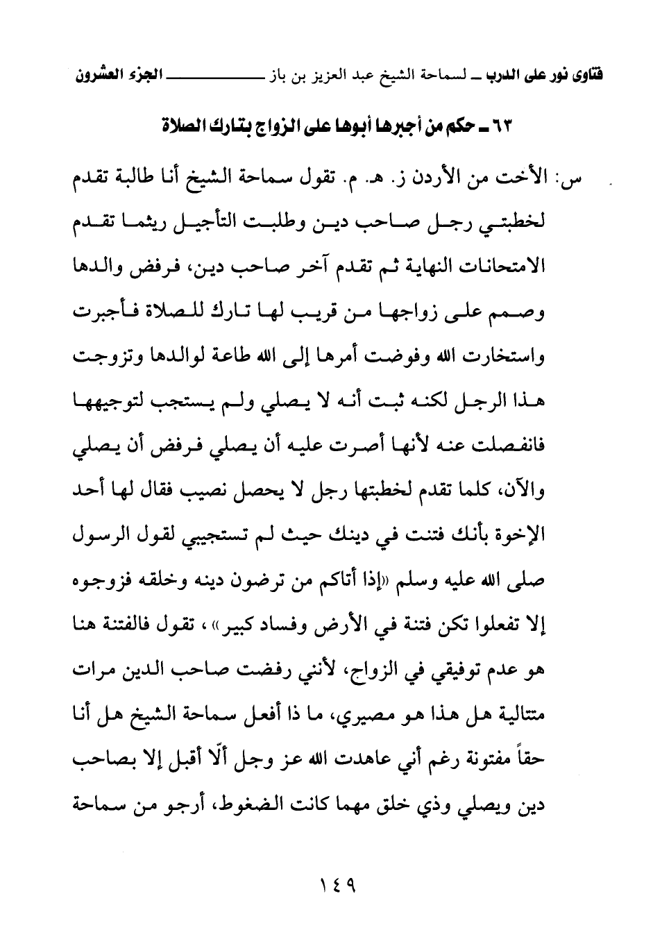 س: الأخت من الأردن ز. هـ. م. تقول سماحة الشيخ أنا طالبة تقدم لخطبتي رجل صاحب دين وطلبت التأجيل ريثما تقدم الامتحانات النهاية ثم تقدم آخر صاحب دين، فرفض والدها وصمم على زواجها من قريب لها تارك للصلاة فأجبرت واستخارت الله وفوضت أمرها إلى الله طاعة لوالدها وتزوجت هذا الرجل لكنه ثبت أنه لا يصلي ولم يستجب لتوجيهها فانفصلت عنه؛ لأنها أصرت عليه أن يصلي فرفض أن يصلي والآن، كلما تقدم لخطبتها رجل لا يحصل نصيب فقال لها أحد الإخوة بأنك فتنت في دينك حيث لم تستجيبي لقول الرسول صلى الله عليه وسلم: «إذا أتاكم من ترضون دينه وخلقه فزوجوه إلا تفعلوا تكن فتنة في الأرض وفساد كبير» (¬1)، تقول فالفتنة هنا هو عدم توفيقي في الزواج؛ لأنني رفضت صاحب الدين مرات متتالية هل هذا هو مصيري، ماذا أفعل سماحة الشيخ هل أنا حقا مفتونة رغم أني عاهدت الله عز وجل ألا أقبل إلا بصاحب دين ويصلي وذي خلق مهما كانت الضغوط، أرجو من سماحة