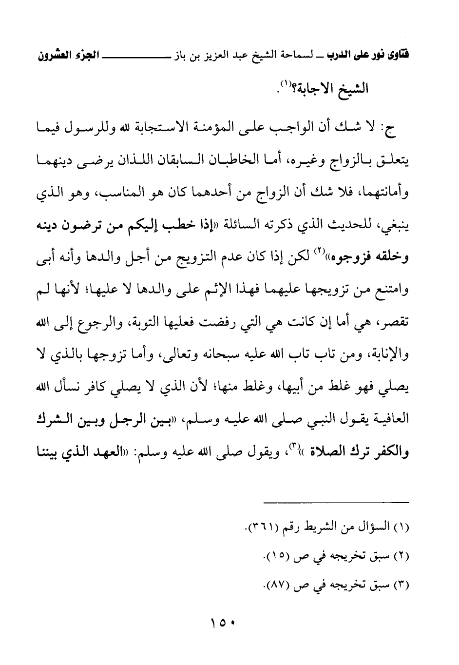 ج: لا شك أن الواجب على المؤمنة الاستجابة لله وللرسول فيما يتعلق بالزواج وغيره، أما الخاطبان السابقان اللذان يرضى دينهما وأمانتهما، فلا شك أن الزواج من أحدهما كان هو المناسب، وهو الذي ينبغي، للحديث الذي ذكرته السائلة: «إذا خطب إليكم من ترضون دينه وخلقه فزوجوه» (¬2) لكن إذا كان عدم التزويج من أجل والدها وأنه أبى وامتنع من تزويجها عليهما فهذا الإثم على والدها لا عليها؛ لأنها لم تقصر هي، أما إن كانت هي التي رفضت فعليها التوبة، والرجوع إلى الله والإنابة، ومن تاب تاب الله عليه سبحانه وتعالى، وأما تزوجا بالذي لا يصلي فهو غلط من أبيها، وغلط منها؛ لأن الذي لا يصلي كافر نسأل الله العافية يقول النبي صلى الله عليه وسلم: «بين الرجل وبين الشرك والكفر ترك الصلاة» (¬3) ويقول صلى الله عليه وسلم: «العهد الذي بيننا
