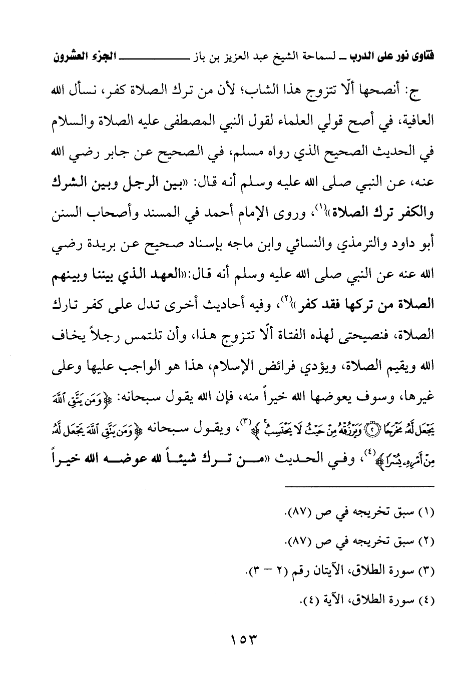 ج: أنصحها ألاّ تتزوج هذا الشاب؛ لأن من ترك الصلاة كفر، نسأل الله العافية، في أصح قولي العلماء لقول النبي المصطفى عليه الصلاة والسلام في الحديث الصحيح الذي رواه مسلم، في الصحيح عن جابر رضي الله عنه، عن النبي صلى الله عليه وسلم أنه قال: «بين الرجل وبين الشرك والكفر ترك الصلاة» (¬1) وروى الإمام أحمد في المسند وأصحاب السنن أبو داود والترمذي والنسائي وابن ماجه بإسناد صحيح عن بريدة رضي الله عنه عن النبي صلى الله عليه وسلم أنه قال: «العهد الذي بيننا وبينهم الصلاة من تركها فقد كفر» (¬2) وفيه أحاديث أخرى تدل على كفر تارك الصلاة، فنصيحتي لهذه الفتاة ألاّ تتزوج هذا، وأن تلتمس رجلاً يخاف الله ويقيم الصلاة، ويؤدي فرائض الإسلام، هذا هو الواجب عليها وعلى غيرها، وسوف يعوضها الله خيرًا منه، فإن الله يقول سبحانه: {وَمَنْ يَتَّقِ اللَّهَ يَجْعَلْ لَهُ مَخْرَجًا (2) وَيَرْزُقْهُ مِنْ حَيْثُ لا يَحْتَسِبُ}، ويقول سبحانه: {وَمَنْ يَتَّقِ اللَّهَ يَجْعَلْ لَهُ مِنْ أَمْرِهِ يُسْرًا}، وفي الحديث: «من ترك شيئًا لله عوضه الله خيرًا