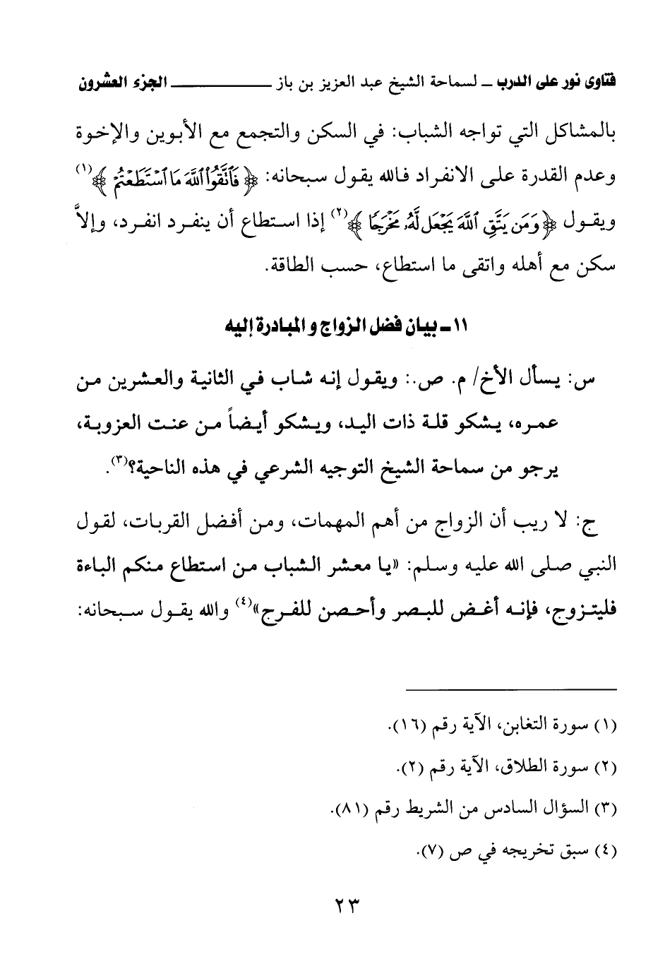 بالمشاكل التي تواجه الشباب: في السكن والتجمع مع الأبوين والإخوة وعدم القدرة على الانفراد فالله يقول سبحانه: {فَاتَّقُوا اللَّهَ مَا اسْتَطَعْتُمْ} ويقول {وَمَنْ يَتَّقِ اللَّهَ يَجْعَلْ لَهُ مَخْرَجًا} إذا استطاع أن ينفرد انفرد، وإلاَّ سكن مع أهله واتقى ما استطاع، حسب الطاقة.