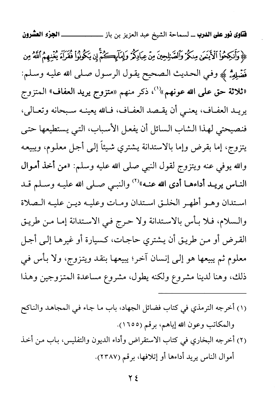 {وَأَنْكِحُوا الأَيَامَى مِنْكُمْ وَالصَّالِحِينَ مِنْ عِبَادِكُمْ وَإِمَائِكُمْ إِنْ يَكُونُوا فُقَرَاءَ يُغْنِهِمُ اللَّهُ مِنْ فَضْلِهِ}، وفي الحديث الصحيح يقول الرسول صلى الله عليه وسلم: «ثلاثة حق على الله عونهم» (¬1) ذكر منهم "متزوج يريد العفاف" المتزوج يريد العفاف، يعني أن يقصد العفاف، فالله يعينه سبحانه وتعالى، فنصيحتي لهذا الشاب السائل أن يفعل الأسباب، التي يستطيعها حتى يتزوج، إما بقرض وإما بالاستدانة يشتري شيئًا إلى أجل معلوم، ويبيعه والله يوفي عنه ويتزوج لقول النبي صلى الله عليه وسلم: «من أخذ أموال الناس يريد أداءها أدى الله عنه» (¬2) والنبي صلى الله عليه وسلم قد استدان وهو أطهر الخلق استدان ومات وعليه دين عليه الصلاة والسلام، فلا بأس بالاستدانة ولا حرج في الاستدانة إما من طريق القرض أو من طريق أن يشتري حاجات، كسيارة أو غيرها إلى أجل معلوم ثم يبيعها هو إلى إنسان آخر؛ يبيعها بنقد ويتزوج، ولا بأس في ذلك، وهنا لدينا مشروع ولكنه يطول، مشروع مساعدة المتزوجين وهذا