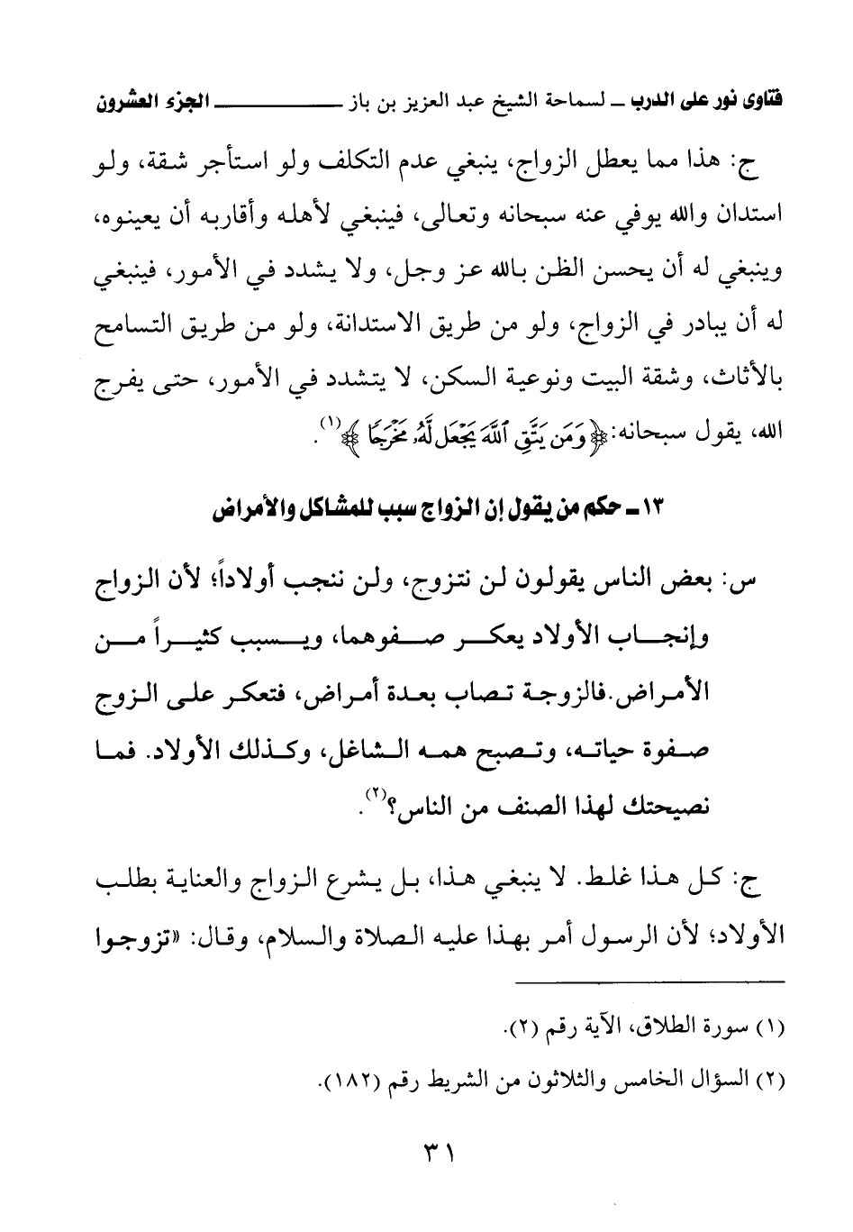 س: بعض الناس يقولون لن نتزوج، ولن ننجب أولادًا؛ لأن الزواج وإنجاب الأولاد يعكر صفوهما، ويسبب كثيرًا من الأمراض، فالزوجة تصاب بعدة أمراض، فتعكر على الزوج صفوة حياته، وتصبح همه الشاغل، وكذلك الأولاد. فما نصيحتك لهذا الصنف من الناس؟ (¬1)