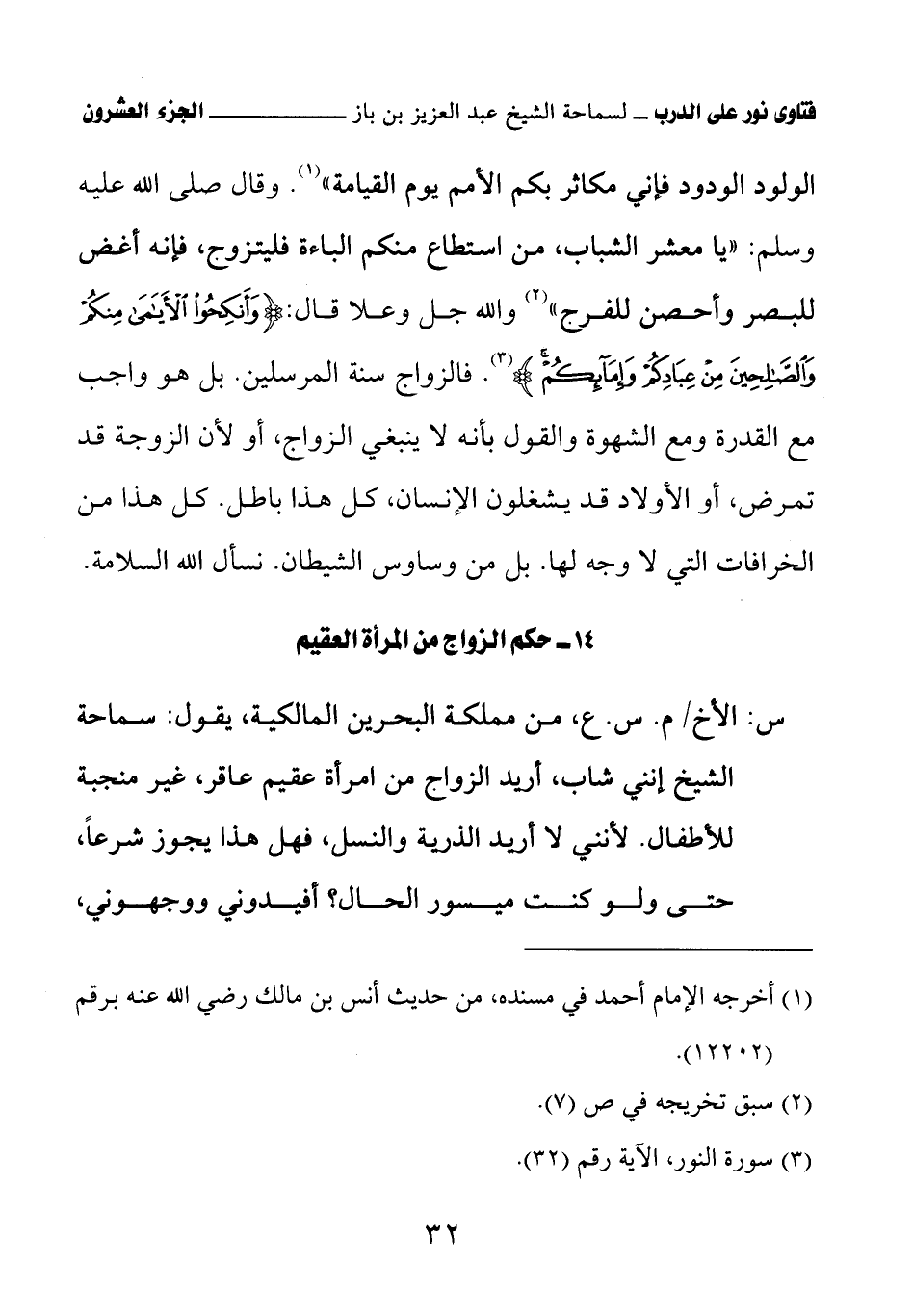 الولود الودود فإني مكاثر بكم الأمم يوم القيامة» (¬1) وقال صلى الله عليه وسلم: «يا معشر الشباب من استطاع منكم الباءة فليتزوج فإنه أغض للبصر وأحصن للفرج» (¬2) والله جل وعلا قال: {وَأَنْكِحُوا الأَيَامَى مِنْكُمْ وَالصَّالِحِينَ مِنْ عِبَادِكُمْ وَإِمَائِكُمْ}. فالزواج سنة المرسلين. بل هو واجب مع القدرة ومع الشهوة، والقول بأنه لا ينبغي الزواج، أو لأن الزوجة قد تمرض، أو الأولاد قد يشغلون الإنسان، كل هذا باطل. كل هذا من الخرافات التي لا وجه لها. بل من وساوس الشيطان، نسأل الله السلامة.