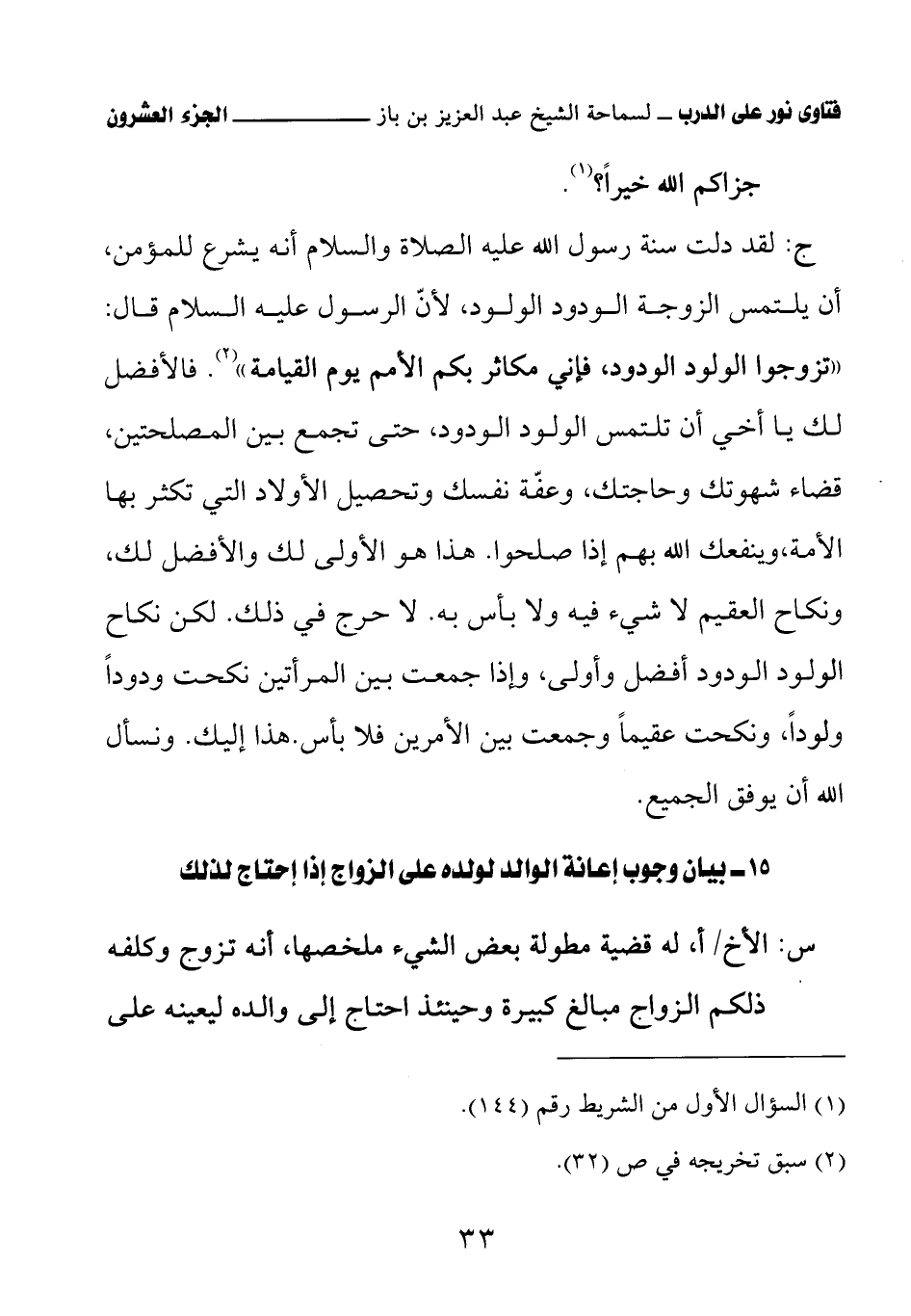 ج: لقد دلت سنة رسول الله عليه الصلاة والسلام أنه يشرع للمؤمن، أن يلتمس الزوجة الودود الولود؛ لأن الرسول عليه السلام قال: «تزوجوا الولود الودود، فإني مكاثر بكم الأمم يوم القيامة» (¬2) فالأفضل لك يا أخي أن تلتمس الولود الودود، حتى تجمع بين المصلحتين؛ قضاء شهوتك وحاجتك، وعفّة نفسك وتحصيل الأولاد التي تكثر بها الأمة، وينفعك الله بهم إذا صلحوا. هذا هو الأولى لك والأفضل لك، ونكاح العقيم لا شيء فيه ولا بأس به. لا حرج في ذلك، لكن نكاح الولود الودود أفضل وأولى، وإذا جمعت بين المرأتين نكحت ودودًا ولودًا، ونكحت عقيمًا وجمعت بين الأمرين فلا بأس. هذا إليك، ونسأل الله أن يوفق الجميع.