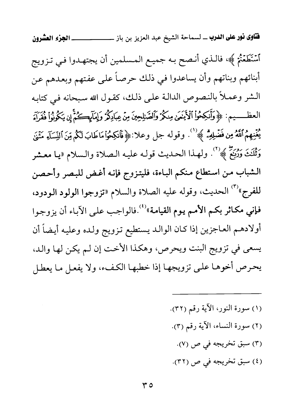 فالذي أنصح به جميع المسلمين أن يجتهدوا في تزويج أبنائهم وبناتهم وأن يساعدوا في ذلك حرصًا على عفتهم وبعدهم عن الشر وعملاً بالنصوص الدالة على ذلك، كقول الله سبحانه في كتابه العظيم: {وَأَنْكِحُوا الأَيَامَى مِنْكُمْ وَالصَّالِحِينَ مِنْ عِبَادِكُمْ وَإِمَائِكُمْ إِنْ يَكُونُوا فُقَرَاءَ يُغْنِهِمُ اللَّهُ مِنْ فَضْلِهِ}، وقوله جل وعلا: {فَانْكِحُوا مَا طَابَ لَكُمْ مِنَ النِّسَاءِ مَثْنَى وَثُلاثَ وَرُبَاعَ}. ولهذا الحديث قوله عليه الصلاة والسلام «يا معشر الشباب من استطاع منكم الباءة، فليتزوج فإنه أغض للبصر وأحصن للفرج» (¬1) الحديث، وقوله عليه الصلاة والسلام «تزوجوا الولود الودود، فإني مكاثر بكم الأمم يوم القيامة» (¬2) فالواجب على الآباء أن يزوجوا أولادهم العاجزين إذا كان الوالد يستطيع تزويج ولده وعليه أيضًا أن يسعى في تزويج البنت ويحرص، وهكذا الأخت إن لم يكن لها والد، يحرص أخوها على تزويجها إذا خطبها الكفء، ولا يفعل ما يعطل