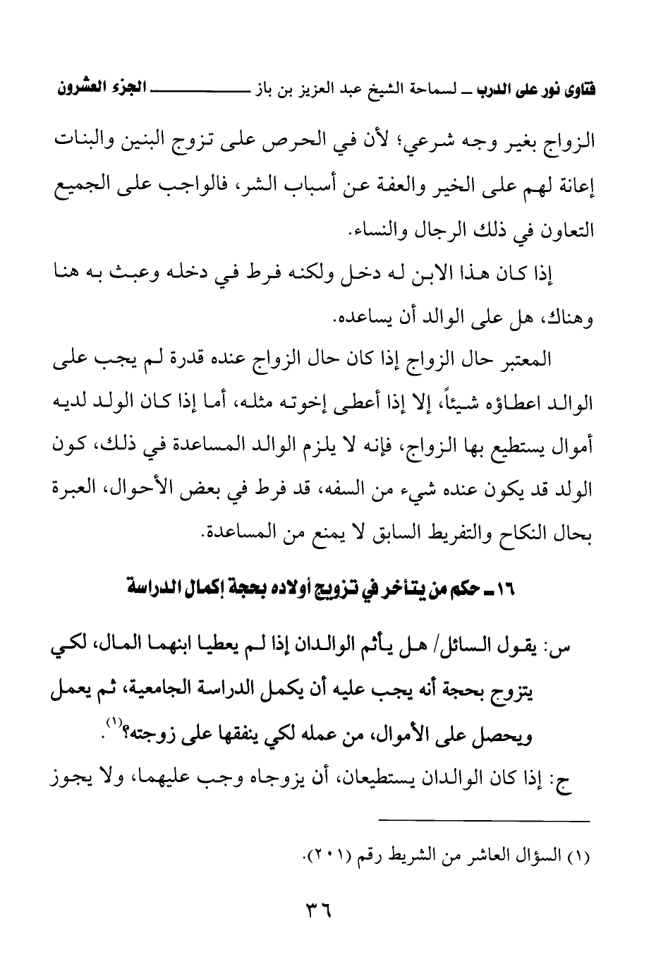 س: يقول السائل هل يأثم الوالدان إذا لم يعطيا ابنهما المال، لكي يتزوج بحجة أنه يجب عليه أن يكمل الدراسة الجامعية، ثم يعمل ويحصل على الأموال، من عمله لكي ينفقها على زوجته؟ (¬1)