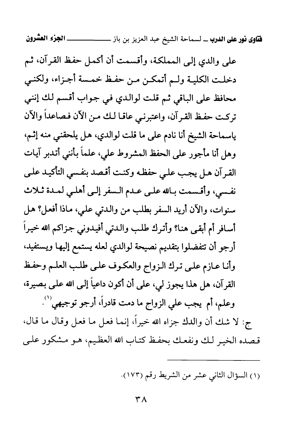 على والدي إلى المملكة، وأقسمت أن أكمل حفظ القرآن، ثم دخلت الكلية ولم أتمكن من حفظ خمسة أجزاء، ولكني محافظ على الباقي ثم قلت لوالدي في جواب أقسم لك أنني تركت حفظ القرآن، واعتبرني عاقًا لك من الآن فصاعدًا والآن يا سماحة الشيخ أنا نادم على ما قلت لوالدي، هل يلحقني منه إثم، وهل أنا مأجور على الحفظ المشروط علي، علمًا بأنني أتدبر آيات القرآن هل يجب علي حفظه، وكنت أقصد بنفسي التأكيد على نفسي، وأقسمت بالله على عدم السفر إلى أهلي لمدة ثلاث سنوات، والآن أريد السفر بطلب من والدتي علي، ماذا أفعل؟ هل أسافر أم أبقى هنا؟ وأترك طلب والدتي أفيدوني جزاكم الله خيرًا أرجو أن تتفضلوا بتقديم نصيحة لوالدي لعله يستمع إليها ويستفيد، وأنا عازم على ترك الزواج والعكوف على طلب العلم وحفظ القرآن، هل هذا يجوز لي، على أن أكون داعيًا إلى الله على بصيرة وعلم، أم يجب علي الزواج ما دمت قادرًا، أرجو توجيهي (¬1)