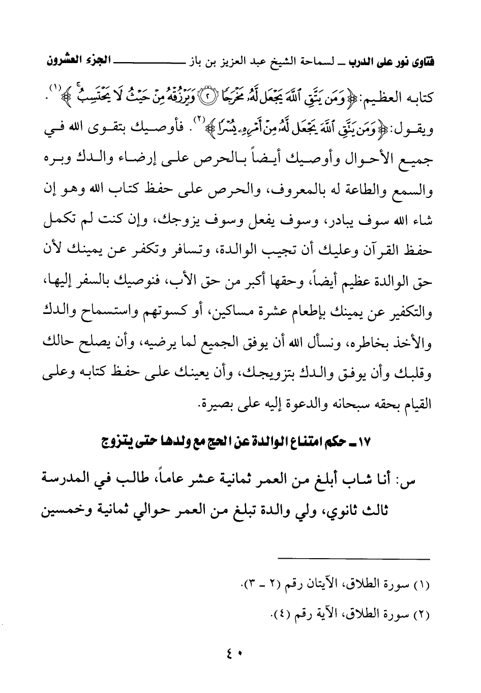 كتابه العظيم: {وَمَنْ يَتَّقِ اللَّهَ يَجْعَلْ لَهُ مَخْرَجًا (2) وَيَرْزُقْهُ مِنْ حَيْثُ لا يَحْتَسِبُ}. ويقول: {وَمَنْ يَتَّقِ اللَّهَ يَجْعَلْ لَهُ مِنْ أَمْرِهِ يُسْرًا}. فأوصيك بتقوى الله في جميع الأحوال وأوصيك أيضًا بالحرص على إرضاء والدك وبره والسمع والطاعة له بالمعروف، والحرص على حفظ كتاب الله وهو إن شاء الله سوف يبادر، وسوف يفعل وسوف يزوجك، وإن كنت لم تكمَّل حفظ القرآن وعليك أن تجيب الوالدة، وتسافر وتكفر عن يمينك؛ لأن حق الوالدة عظيم أيضًا، وحقها أكبر من حق الأب، فنوصيك بالسفر إليها، والتكفير عن يمينك بإطعام عشرة مساكين، أو كسوتهم واستسماح والدك والأخذ بخاطره، ونسأل الله أن يوفق الجميع لما يرضيه، وأن يصلح حالك وقلبك وأن يوفق والدك بتزويجك، وأن يعينك على حفظ كتابه وعلى القيام بحقه سبحانه والدعوة إليه على بصيرة.