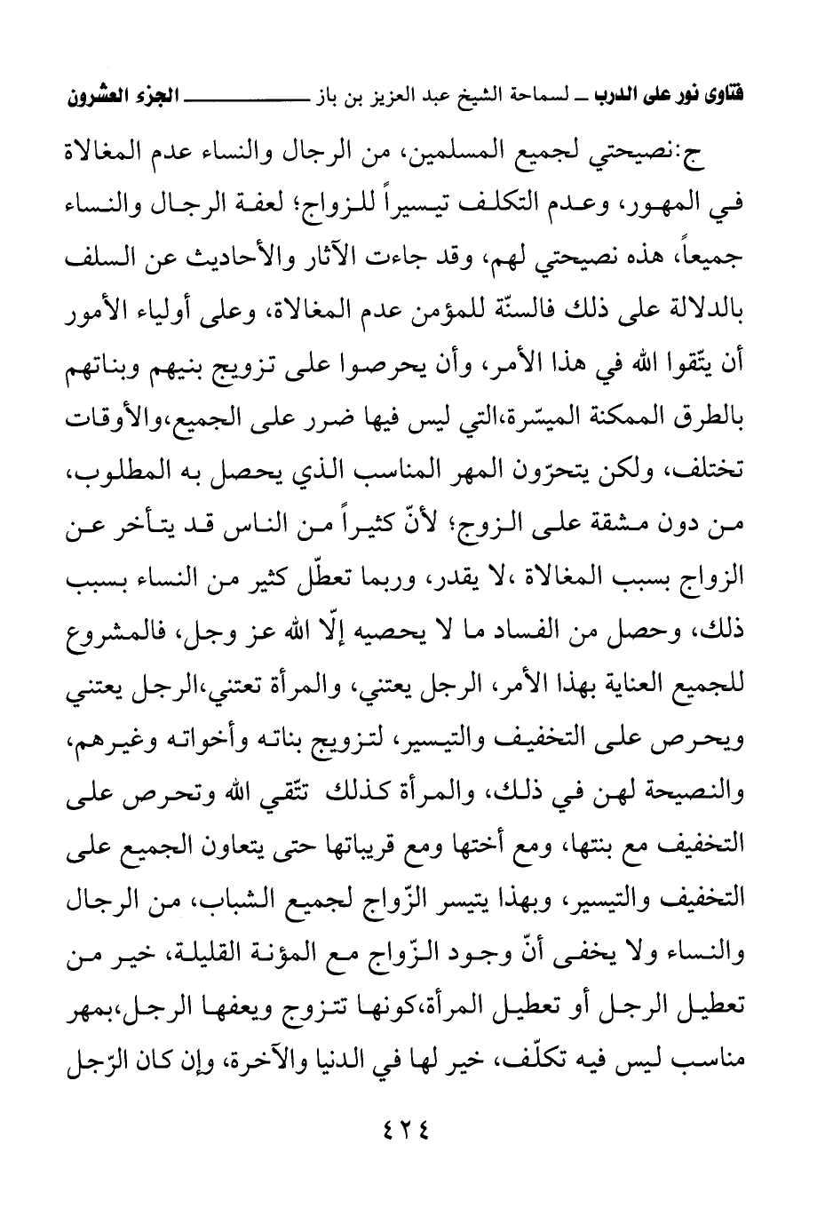 ج: نصحيتي لجميع المسلمين، من الرجال والنساء عدم المغالاة في المهور، وعدم التكلف تيسيرًا للزواج؛ لعفة الرجال والنساء جميعًا، هذه نصيحتي لهم، وقد جاءت الآثار والأحاديث عن السلف بالدلالة على ذلك فالسنّة للمؤمن عدم المغالاة، وعلى أولياء الأمور أن يتقوا الله في هذا الأمر، وأن يحرصوا على تزويج بنيهم وبناتهم بالطرق الممكنة الميسّرة، التي ليس فيها ضرر على الجميع، والأوقات تختلف، ولكن يتحرّون المهر المناسب الذي يحصل به المطلوب، من دون مشقة على الزوج؛ لأنَّ كثيرًا من الناس قد يتأخر عن الزواج بسبب المغالاة، لا يقدر، وربما تعطّل كثيرٌ من النساء بسبب ذلك، وحصل من الفساد ما لا يحصيه إلاّ الله عز وجل، فالمشروع للجميع العناية بهذا الأمر، الرجل يعتني، والمرأة تعتني، الرجل يعتني ويحرص على التخفيف والتيسير، لتزويج بناته وأخواته وغيرهم، والنصيحة لهن في ذلك، والمرأة كذلك تتقي الله وتحرص على التخفيف مع بنتها، ومع أختها ومع قريباتها حتى يتعاون الجميع على التخفيف والتيسير، وبهذا يتيسر الزَّواج لجميع الشباب، من الرجال والنساء ولا يخفى أنّ وجود الزّواج مع المؤنة القليلة، خيرٌ من تعطيل الرجل أو تعطيل المرأة، كونها تتزوج ويعفها الرجل، بمهرٍ مناسب ليس فيه تكلّف، خيرٌ لها في الدنيا والآخرة، وإن كان الرّجل