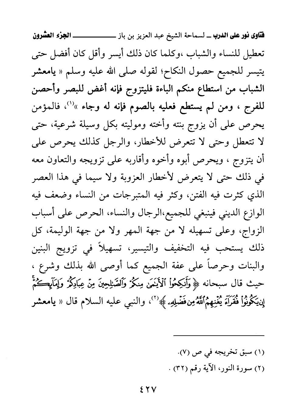 تعطيل للنساء والشباب، وكلما كان ذلك أيسر وأقل كان أفضل حتى يتيسر للجميع حصول النكاح؛ لقوله صلى الله عليه وسلم: «يا معشر الشباب من استطاع منكم الباءة فليتزوج، فإنه أغض للبصر وأحصن للفرج، ومن لم يستطع فعليه بالصوم فإنه له وجاء» (¬1) فالمؤمن يحرص على أن يزوج بنته وأخته وموليته بكل وسيلة شرعية، حتى لا تتعطل وحتى لا تتعرض للأخطار، والرجل كذلك يحرص على أن يتزوج، ويحرص أبوه وأخوه وأقاربه على تزويجه والتعاون معه في ذلك حتى لا يتعرض لأخطار العزوبة ولا سيما في هذا العصر الذي كثرت فيه الفتن، وكثر فيه المتبرجات من النساء، وضعف فيه الوازع الديني فينبغي للجميع، الرجال والنساء، الحرص على أسباب الزواج، وعلى تسهيله لا من جهة المهر، ولا من جهة الوليمة، كل ذلك يستحب فيه التخفيف والتيسير، تسهيلاً في تزويج البنين والبنات وحرصًا على عفة الجميع كما أوصى الله بذلك وشرع، حيث قال سبحانه: {وَأَنْكِحُوا الأَيَامَى مِنْكُمْ وَالصَّالِحِينَ مِنْ عِبَادِكُمْ وَإِمَائِكُمْ إِنْ يَكُونُوا فُقَرَاءَ يُغْنِهِمُ اللَّهُ مِنْ فَضْلِهِ}، والنبي عليه السلام قال: «يا معشر