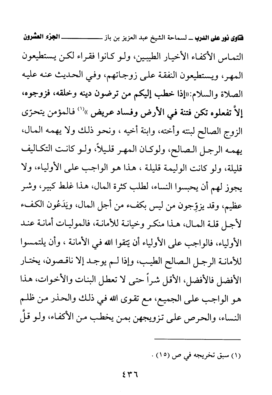 التماس الأكفاء الأخيار الطيبين، ولو كانوا فقراء لكن يستطيعون المهر، ويستطيعون النفقة على زوجاتهم، وفي الحديث عنه عليه الصلاة والسلام: «إذا خطب إليكم من ترضون دينه وخلقه، فزوجوه، إلاّ تفعلوه تكن فتنة في الأرض وفساد عريض» (¬1) فالمؤمن يتحرّى الزوج الصالح لبنته وأخته، وابنة أخيه، ونحو ذلك ولا يهمه المال، يهمه الرجل الصالح، ولو كان المهر قليلاً، ولو كانت التكاليف قليلة، ولو كانت الوليمة قليلة، هذا هو الواجب على الأولياء، ولا يجوز لهم أن يحبسوا النساء، لطلب كثرة المال، هذا غلط كبير، وشر عظيم، وقد يزوّجون من ليس بكفء من أجل المال، ويَدَعُون الكفء لأجل قلة المال، هذا منكر وخيانة للأمانة، فالموليات أمانة عند الأولياء، فالواجب على الأولياء أن يتّقوا الله في الأمانة، وأن يلتمسوا للأمانة الرجل الصالح الطيب، وإذا لم يوجد إلا ناقصون، يختار الأفضل فالأفضل، والأقل شرًا حتى لا تعطل البنات والأخوات، هذا هو الواجب على الجميع، مع تقوى الله في ذلك والحذر من ظلم النساء، والحرص على تزويجهن بمن يخطب من الأكفاء ولو قلَّ