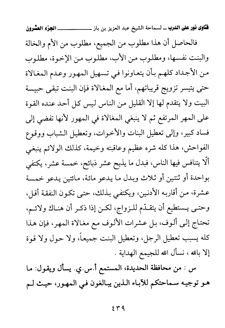 س: من محافظة الحديدة المستمع أ. س. ي. يسأل ويقول: ما هو توجيه سماحتكم للآباء الذين يبالغون في المهور، حيث لم
