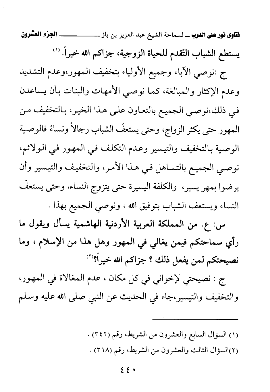 س: ع. من المملكة العربية الأردنية الهاشمية يسأل ويقول ما رأي سماحتكم فيمن يغالي في المهور، وهل هذا من الإسلام، وما نصيحتكم لمن يفعل ذلك؟ جزاكم الله خيرًا؟ (¬1)
