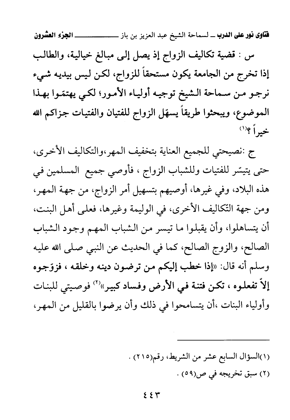 ج: نصيحتي للجميع العناية بتخفيف المهر، والتكاليف الأخرى، حتى يتيسّر للفتيات وللشباب الزواج، فأوصي جميع المسلمين في هذه البلاد، وفي غيرها، أوصيهم بتسهيل أمر الزواج، من جهة المهر، ومن جهة التّكاليف الأخرى، في الوليمة وغيرها، فعلى أهل البنت، أن يتساهلوا، وأن يقبلوا ما تيسر من الشباب المهم وجود الشباب الصالح، والزوج الصالح، كما في الحديث عن النبي صلى الله عليه وسلم أنه قال: «إذا خطب إليكم من ترضون دينه وخلقه، فزوّجوه جوه إلاّ تفعلوه، تكن فتنة في الأرض وفساد كبير» (¬2) فوصيتي للبنات وأولياء البنات، أن يتسامحوا في ذلك وأن يرضوا بالقليل من المهر،