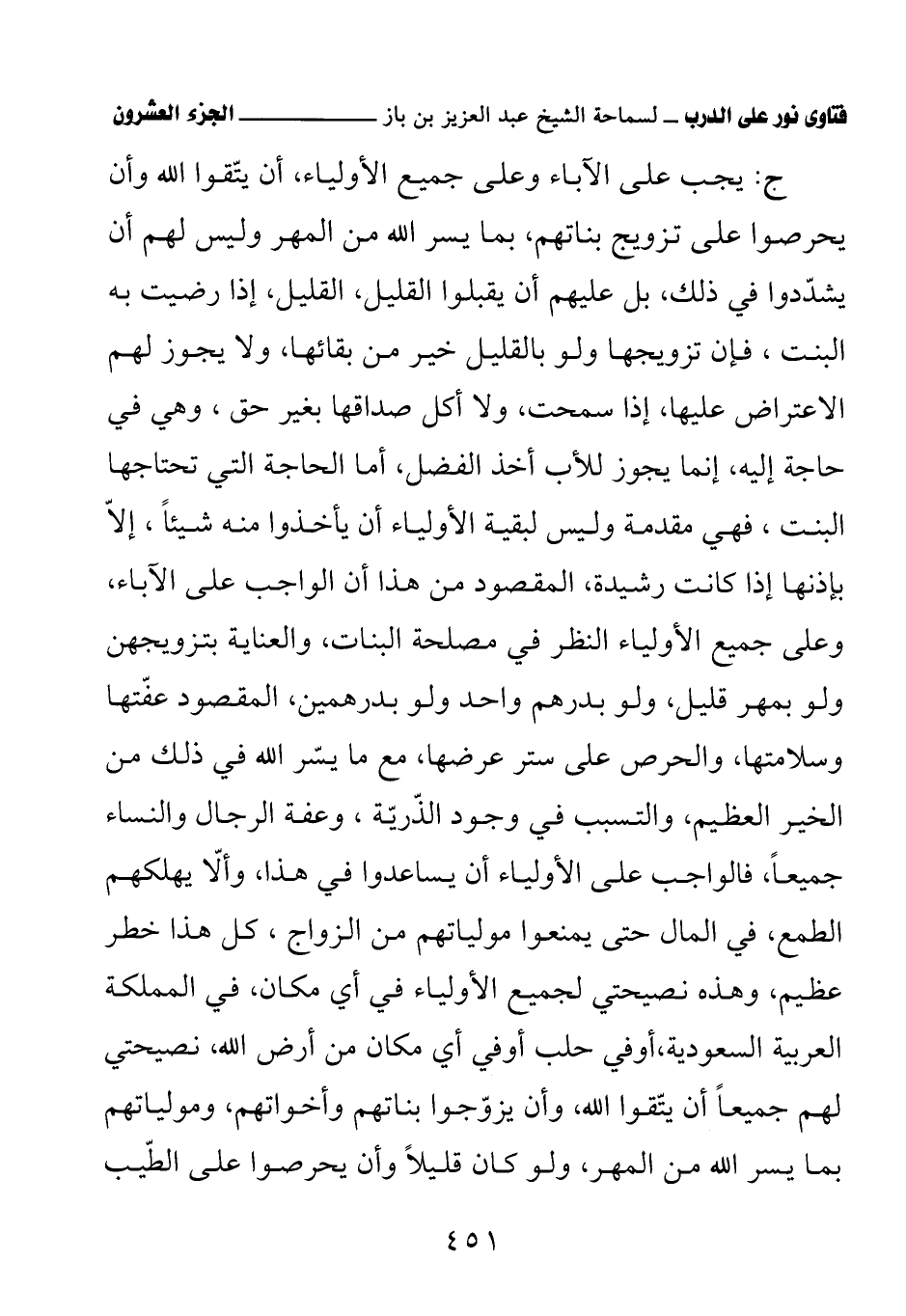 ج: يجب على الآباء وعلى جميع الأولياء، أن يتّقوا الله وأن يحرصوا على تزويج بناتهم، بما يسر الله من المهر وليس لهم أن يشدّدوا في ذلك، بل عليهم أن يقبلوا القليل، القليل، إذا رضيت به البنت، فإن تزويجها ولو بالقليل خير من بقائها، ولا يجوز لهم الاعتراض عليها، إذا سمحت، ولا أكل صداقها بغير حق، وهي في حاجة إليه، إنما يجوز للأب أخذ الفضل، أما الحاجة التي تحتاجها البنت، فهي مقدمة وليس لبقية الأولياء أن يأخذوا منه شيئًا، إلا بإذنها، إذا كانت رشيدة، المقصود من هذا أن الواجب على الآباء، وعلى جميع الأولياء النظر في مصلحة البنات، والعناية بتزويجهن ولو بمهرٍ قليل، ولو بدرهمٍ واحد، ولو بدرهمين، المقصود عفّتها وسلامتها، والحرص على ستر عرضها مع ما يسّر الله في ذلك من الخير العظيم، والتسبب في وجود الذّريّة، وعفة الرجال والنساء جميعًا، فالواجب على الأولياء أن يساعدوا في هذا، وألاّ يهلكهم الطمع، في المال حتى يمنعوا مولياتهم من الزواج، كل هذا خطرٌ عظيم، وهذه نصيحتي لجميع الأولياء في أي مكان، في المملكة العربية السعودية، أو في حلب أو في أي مكان من أرض الله، نصيحتي لهم جميعًا أن يتّقوا الله، وأن يزوّجوا بناتهم وأخواتهم، ومولياتهم بما يسر الله من المهر، ولو كان قليلاً، وأن يحرصوا على الطّيب