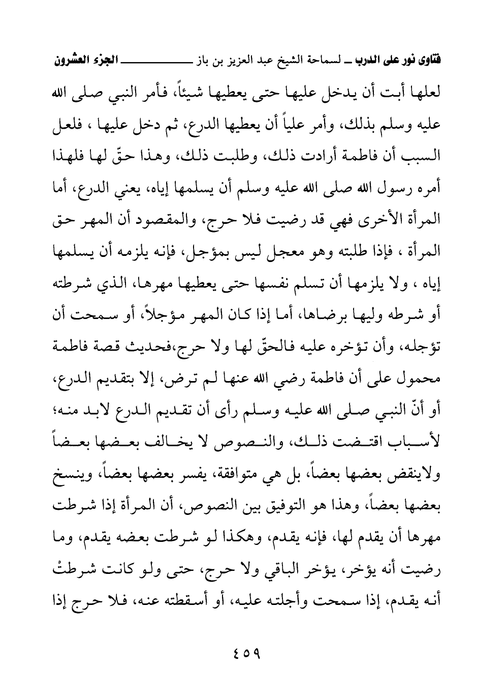 لعلها أبت أن يدخل عليها حتى يعطيها شيئًا، فأمر النبي صلى الله عليه وسلم بذلك، وأمر عليًا أن يعطيها الدرع، ثم دخل عليها، فلعل السبب أن فاطمة أرادت ذلك، وطلبت ذلك، وهذا حقّ لها فلهذا أمره رسول الله صلى الله عليه وسلم أن يسلمها إياه، يعني الدرع، أما المرأة الأخرى فهي قد رضيت فلا حرج، والمقصود أن المهر حق المرأة، فإذا طلبته وهو معجل ليس بمؤجل، فإنه يلزمه أن يسلمها إياه، ولا يلزمها أن تسلم نفسها حتى يعطيها مهرها، الذي شرطته أو شرطه وليها برضاها، أما إذا كان المهر مؤجلاً، أو سمحت أن تؤجله، وأن تؤخره عليه فالحقّ لها ولا حرج، فحديث قصة فاطمة محمول على أن فاطمة رضي الله عنها لم ترض، إلا بتقديم الدرع، أو أن النبي صلى الله عليه وسلم رأى أن تقديم الدرع لا بد منه؛ لأسباب اقتضت ذلك، والنصوص لا يخالف بعضها بعضًا ولا ينقض بعضها بعضًا، بل هي متوافقة، يفسر بعضها بعضًا، وينسخ بعضها بعضًا، وهذا هو التوفيق بين النصوص، أن المرأة إذا شرطت مهرها أن يقدم لها، فإنه يقدم، وهكذا لو شرطت بعضه يقدم، وما رضيت أنه يؤخر، يؤخر الباقي ولا حرج، حتى ولو كانت شرطت أنه يقدم، إذا سمحت وأجلته عليه، أو أسقطته عنه، فلا حرج إذا