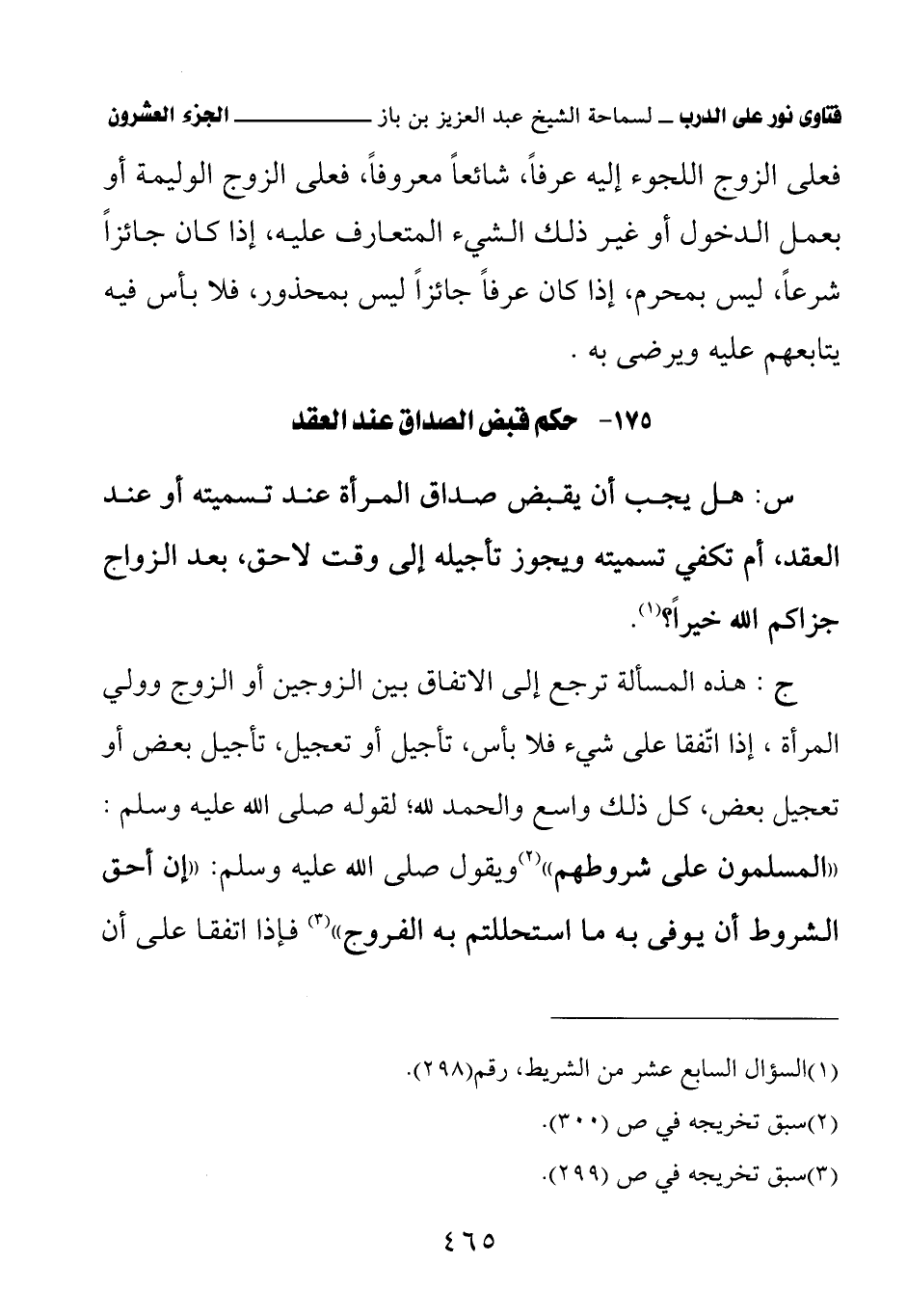 ج: هذه المسألة ترجع إلى الاتفاق بين الزوجين أو الزوج وولي المرأة، إذا اتفقا على شيء فلا بأس، تأجيل أو تعجيل، تأجيل بعض أو تعجيل بعض، كل ذلك واسع والحمد لله؛ لقوله صلى الله عليه وسلم: «المسلمون على شروطهم» (¬2) ويقول صلى الله عليه وسلم: «إن أحق الشروط أن يوفى به ما استحللتم به الفروج» (¬3) فإذا اتفقا على أن
