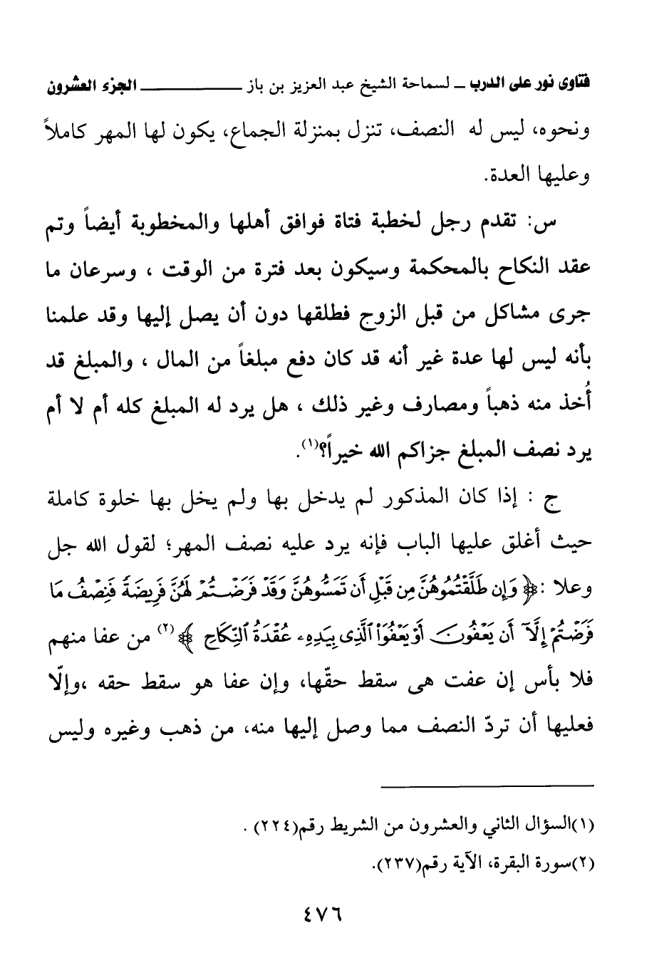 ج: إذا كان المذكور لم يدخل بها ولم يخلو بها خلوة كاملة حيث أغلق عليها الباب فإنه يرد عليه نصف المهر؛ لقول الله جل وعلا: {وَإِنْ طَلَّقْتُمُوهُنَّ مِنْ قَبْلِ أَنْ تَمَسُّوهُنَّ وَقَدْ فَرَضْتُمْ لَهُنَّ فَرِيضَةً فَنِصْفُ مَا فَرَضْتُمْ إِلا أَنْ يَعْفُونَ أَوْ يَعْفُوَ الَّذِي بِيَدِهِ عُقْدَةُ النِّكَاحِ} من عفا منهم فلا بأس إن عفت هي سقط حقّها، وإن عفا هو سقط حقه، وإلاّ فعليها أن تردّ النصف مما وصل إليها منه، من ذهب وغيره وليس