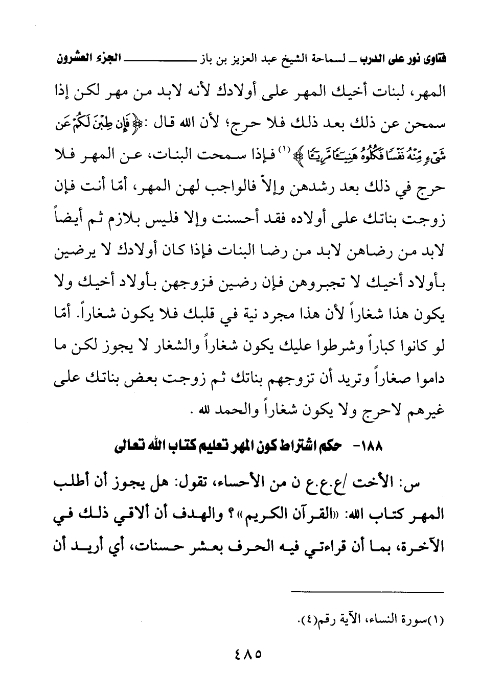 188 - حكم اشتراط كون المهر تعليم كتاب الله تعالى
