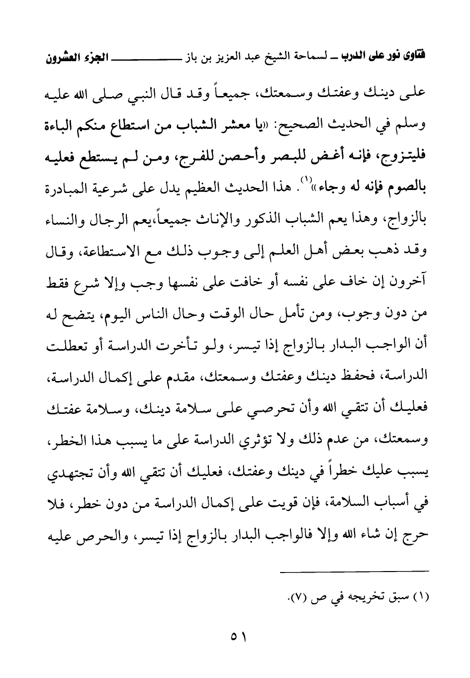 على دينك وعفتك وسمعتك، جميعًا وقد قال النبي صلى الله عليه وسلم في الحديث الصحيح: «يا معشر الشباب من استطاع منكم الباءة فليتزوج، فإنه أغض للبصر وأحصن للفرج، ومن لم يستطع فعليه بالصوم فإنه له وجاء» (¬1) هذا الحديث العظيم يدل على شرعية المبادرة بالزواج، وهذا يعم الشباب الذكور والإناث جميعًا، يعم الرجال والنساء وقد ذهب بعض أهل العلم إلى وجوب ذلك مع الاستطاعة، وقال آخرون إن خاف على نفسه أو خافت على نفسها وجب وإلا شرع فقط من دون وجوب، ومن تأمل حال الوقت وحال الناس اليوم، يتضح له أن الواجب البدار بالزواج إذا تيسر، ولو تأخرت الدراسة أو تعطلت الدراسة، فحفظ دينك وعفتك وسمعتك، مقدم على إكمال الدراسة، فعليك أن تتقي الله وأن تحرصي على سلامة دينك، وسلامة عفتك وسمعتك، من عدم ذلك ولا تؤثري الدراسة على ما يسبب هذا الخطر، يسبب عليك خطرًا في دينك وعفتك، فعليك أن تتقي الله وأن تجتهدي في أسباب السلامة، فإن قويت على إكمال الدراسة من دون خطر، فلا حرج إن شاء الله وإلا فالواجب البدار بالزواج إذا تيسر، والحرص عليه