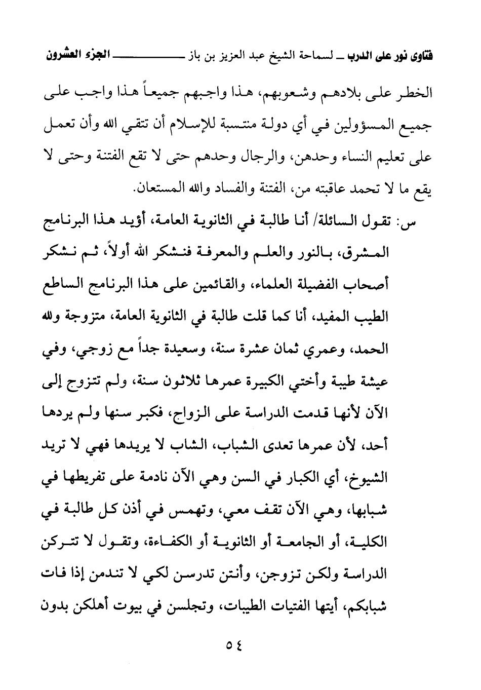 الخطر على بلادهم وشعوبهم، هذا واجبهم جميعًا هذا واجب على جميع المسؤولين في أي دولة منتسبة للإسلام أن تتقي الله وأن تعمل على تعليم النساء وحدهن، والرجال وحدهم حتى لا تقع الفتنة وحتى لا يقع ما لا تحمد عاقبته من الفتنة والفساد والله المستعان.