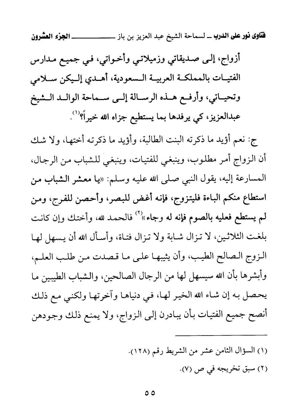 ج: نعم أؤيد ما ذكرته البنت الطالبة، وأؤيد ما ذكرته أختها، ولا شك أن الزواج أمر مطلوب، وينبغي للفتيات، وينبغي للشباب من الرجال، المسارعة إليه، يقول النبي صلى الله عليه وسلم: «يا معشر الشباب من استطاع منكم الباءة فليتزوج، فإنه أغض للبصر، وأحصن للفرج، ومن لم يستطع فعليه بالصوم فإنه له وجاء» (¬2) فالحمد لله، وأختك وإن كانت بلغت الثلاثين، لا تزال شابة ولا تزال فتاة، وأسأل الله أن يسهل لها الزوج الصالح الطيب، وأن يثيبها على ما قصدت من طلب العلم، وأبشرها بأن الله سيسهل لها من الرجال الصالحين، والشباب الطيبين ما يحصل به إن شاء الله الخير لها، في دنياها وآخرتها ولكني مع ذلك أنصح جميع الفتيات بأن يبادرن إلى الزواج، ولا يمنع ذلك وجودهن