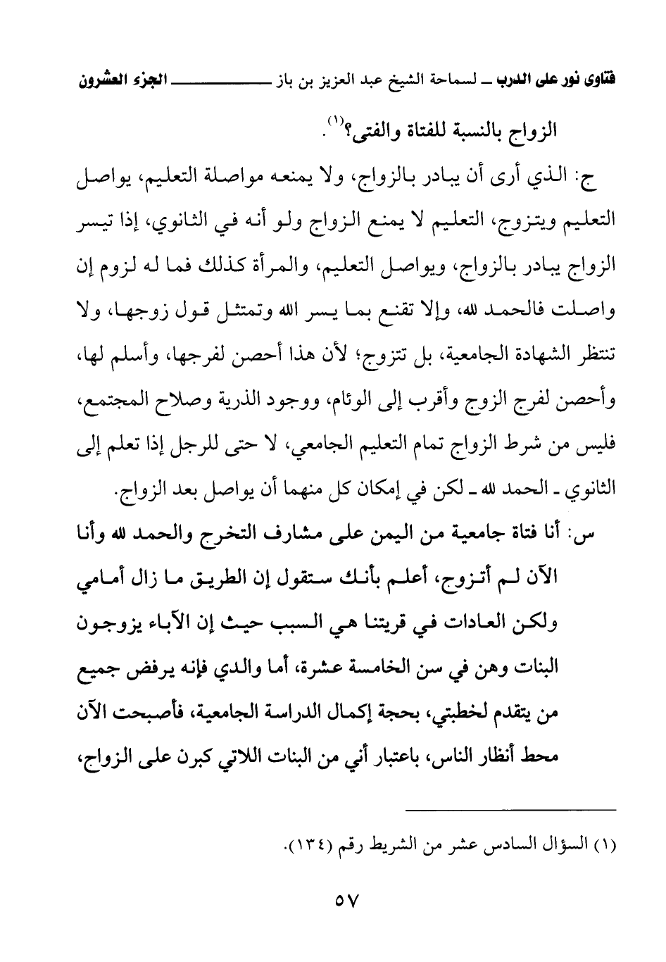 ج: الذي أرى أن يبادر بالزواج، ولا يمنعه مواصلة التعليم، يواصل التعليم ويتزوج، التعليم لا يمنع الزواج ولو أنه في الثانوي، إذا تيسر الزواج يبادر بالزواج، ويواصل التعليم، والمرأة كذلك فما له لزوم إن واصلت فالحمد لله، وإلا تقنع بما يسر الله وتمتثل قول زوجها، ولا تنتظر الشهادة الجامعية، بل تتزوج؛ لأن هذا أحصن لفرجها، وأسلم لها، وأحصن لفرج الزوج وأقرب إلى الوئام، ووجود الذرية وصلاح المجتمع، فليس من شرط الزواج تمام التعليم الجامعي، لا حتى للرجل إذا تعلم إلى الثانوي -الحمد لله- لكن في إمكان كل منهما أن يواصل بعد الزواج.