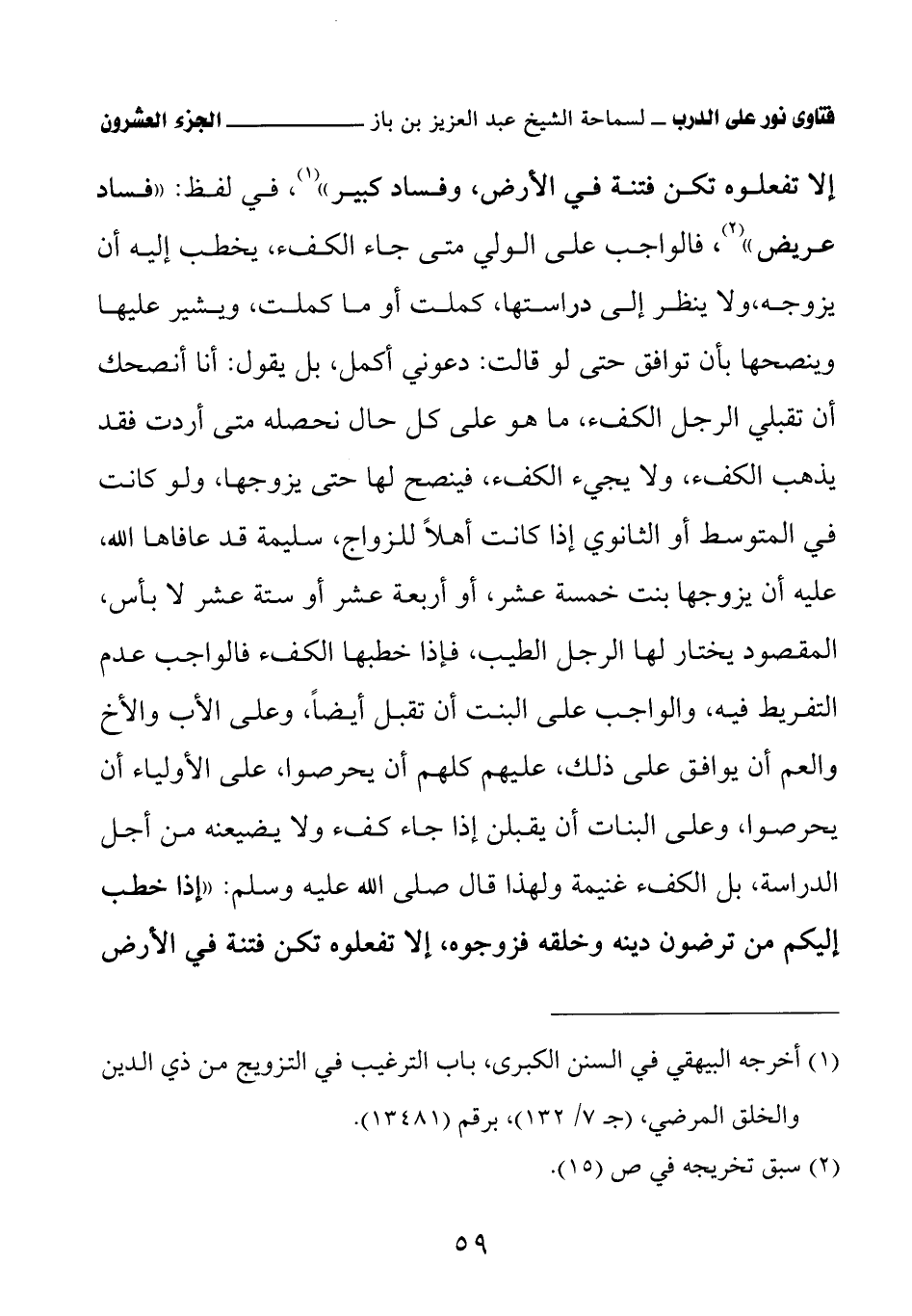إلا تفعلوه تكن فتنة في الأرض، وفساد كبير» (¬1) في لفظ: «فساد عريض» (¬2) فالواجب على الولي متى جاء الكفء، يخطب إليه أن يزوجه، ولا ينظر إلى دراستها، كملت أو ما كملت، ويشير عليها وينصحها بأن توافق حتى لو قالت: دعوني أكمل، بل يقول: أنا أنصحك أن تقبلي الرجل الكفء، ما هو على كل حال نحصله متى أردت فقد يذهب الكفء، ولا يجيء الكفء، فينصح لها حتى يزوجها، ولو كانت في المتوسط أو الثانوي إذا كانت أهلاً للزواج، سليمة قد عافاها الله، عليه أن يزوجها بنت خمسة عشر، أو أربعة عشر أو ستة عشر لا بأس، المقصود يختار لها الرجل الطيب، فإذا خطبها الكفء فالواجب عدم التفريط فيه، والواجب على البنت أن تقبل أيضًا، وعلى الأب والأخ والعم أن يوافق على ذلك، عليهم كلهم أن يحرصوا، على الأولياء أن يحرصوا، وعلى البنات أن يقبلن إذا جاء كفء ولا يضيعنه من أجل الدراسة، بل الكفء غنيمة ولهذا قال صلى الله عليه وسلم: «إذا خطب إليكم من ترضون دينه وخلقه فزوجوه، إلا تفعلوه تكن فتنةٌ في الأرض